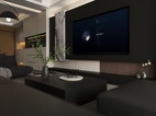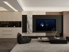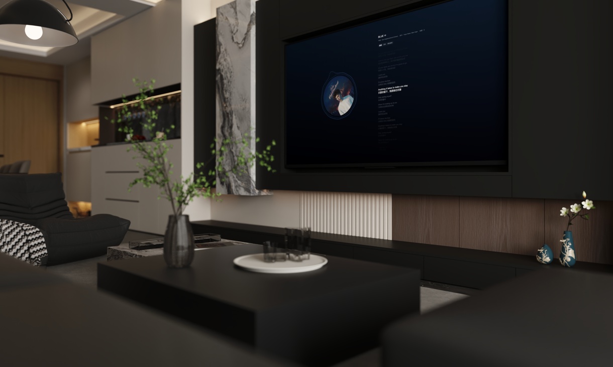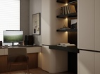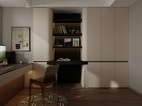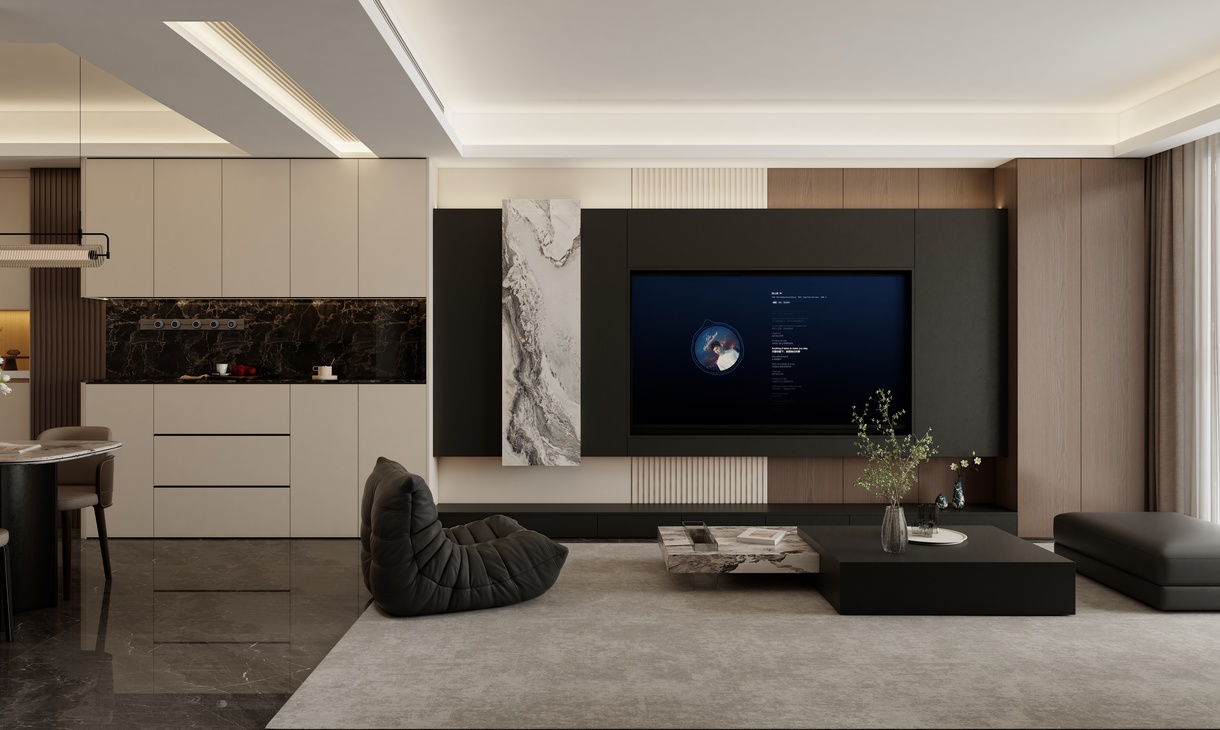 電視墻顏色以灰色和木色搭配,正面電視墻用天然奢石,電視做內嵌式的設計增加整體的層次感,下邊做鏤空樣式,使整體看上去更多樣豐富。