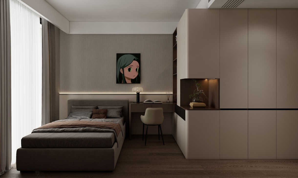 ??簡約大氣不需要過多繁雜的造型,暖色調的墻漆簡單的掛畫搭配使得空間融洽,床頭吊燈為整體空間增加光彩,溫馨的色彩讓情緒得到舒緩。