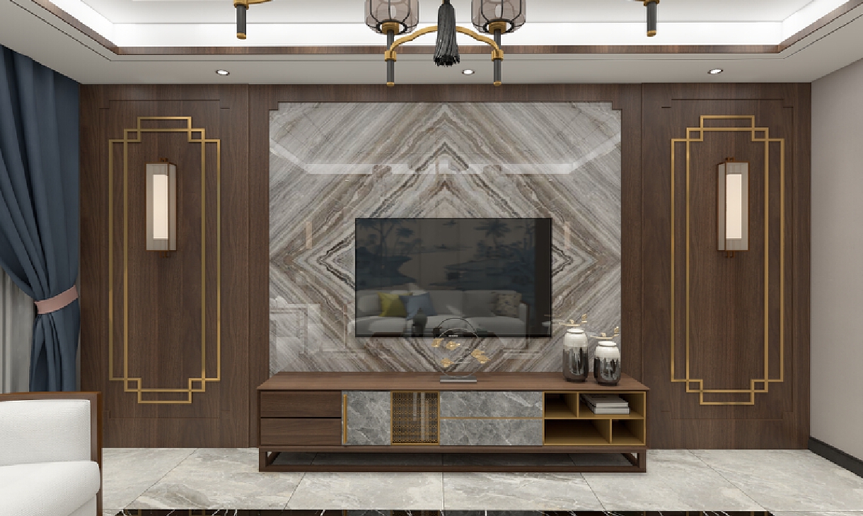 主臥設(shè)計(jì)在色彩方面秉承了傳統(tǒng)新中式的典雅和高貴,背景墻兩邊突出部分用木飾面與黑色線條相結(jié)合,成熟穩(wěn)重的木地板瓷磚,顯得更加舒適靜謐,溫馨大氣。