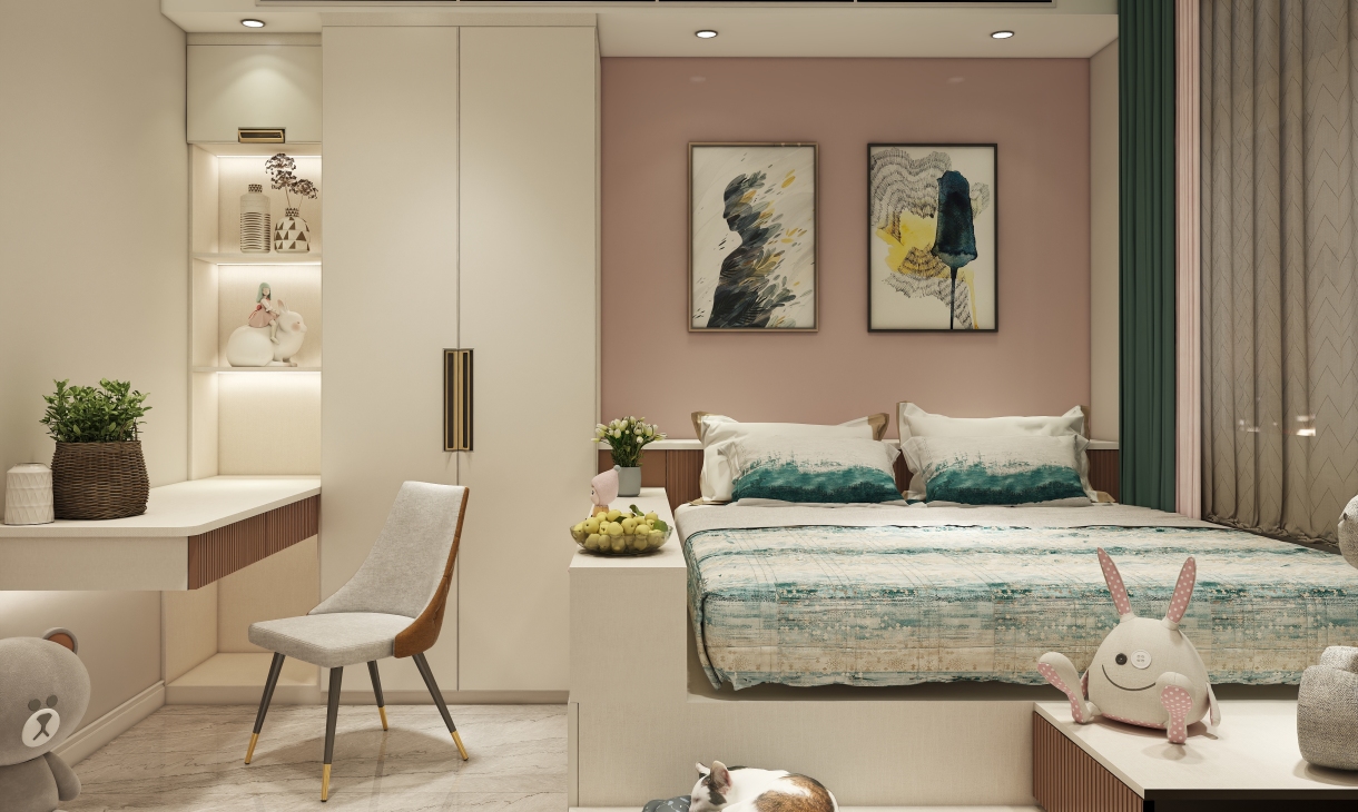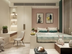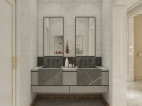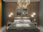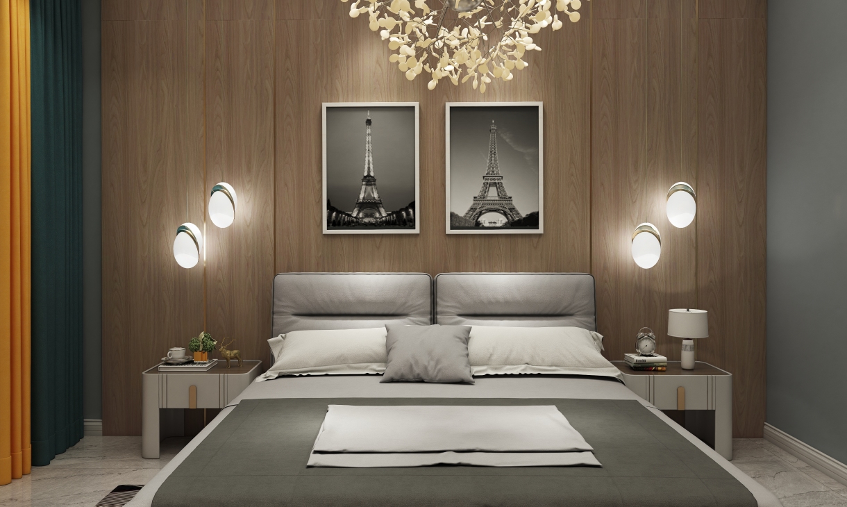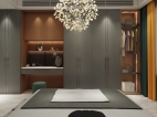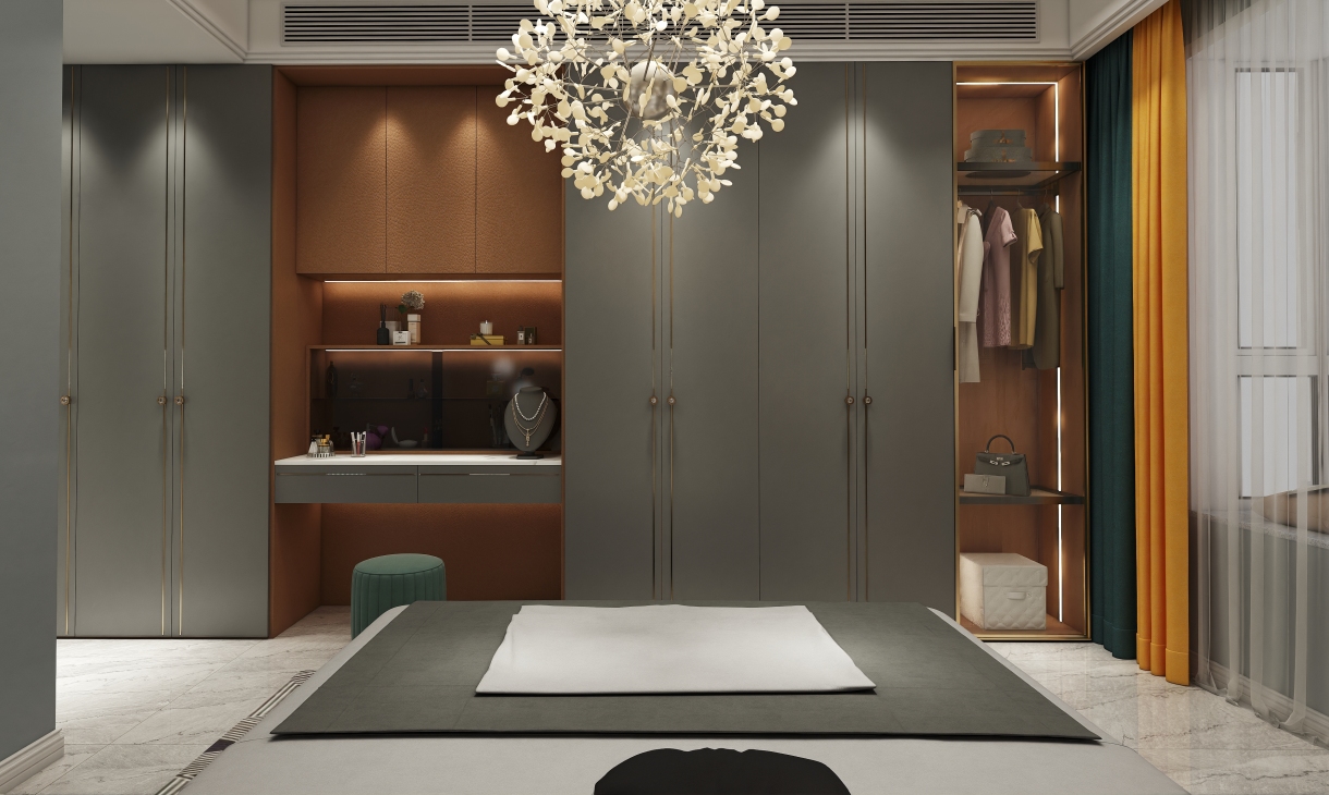 五十度灰的啞光鑲鉆烤漆門板搭配愛馬仕橙的柜體,搭配淺灰色墻面,讓人沉浸在一種寧靜、奢華的睡眠氛圍中。