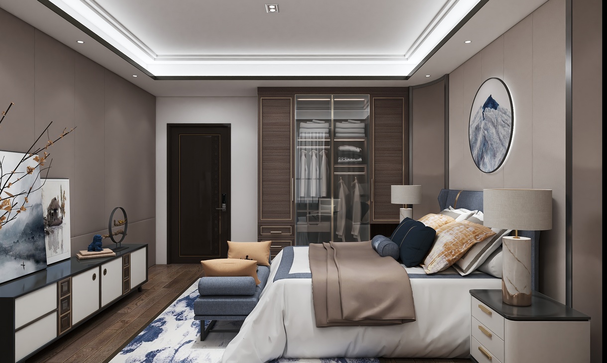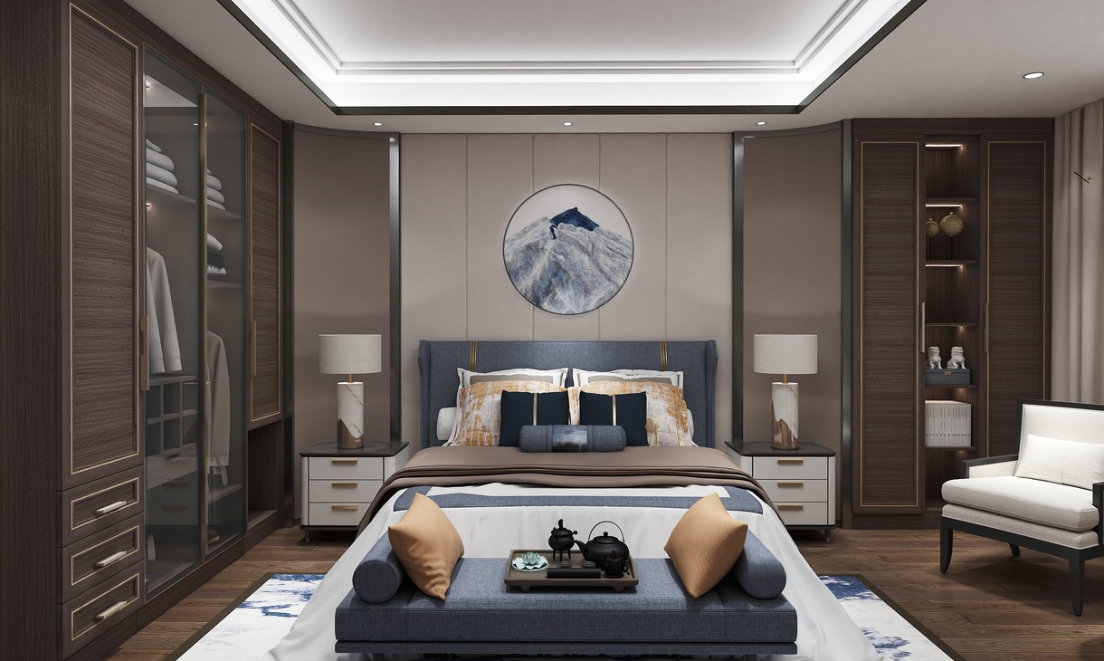 生活,就是朝起暮落的輾轉(zhuǎn)。 霧藍(lán)與鍺橘色的相互搭配,讓空間色彩鮮明的同時也汲取到了東方的寧靜,在整個空間勾勒出別樣的中式韻味。天圓地方古來皆知,掛畫為"圓"床為"方",是貫穿歲月褪去浮華的素凈之美。日落月升,于光影之間營造出意境深遠(yuǎn)的空間氛圍,令人不自覺沉浸其中。