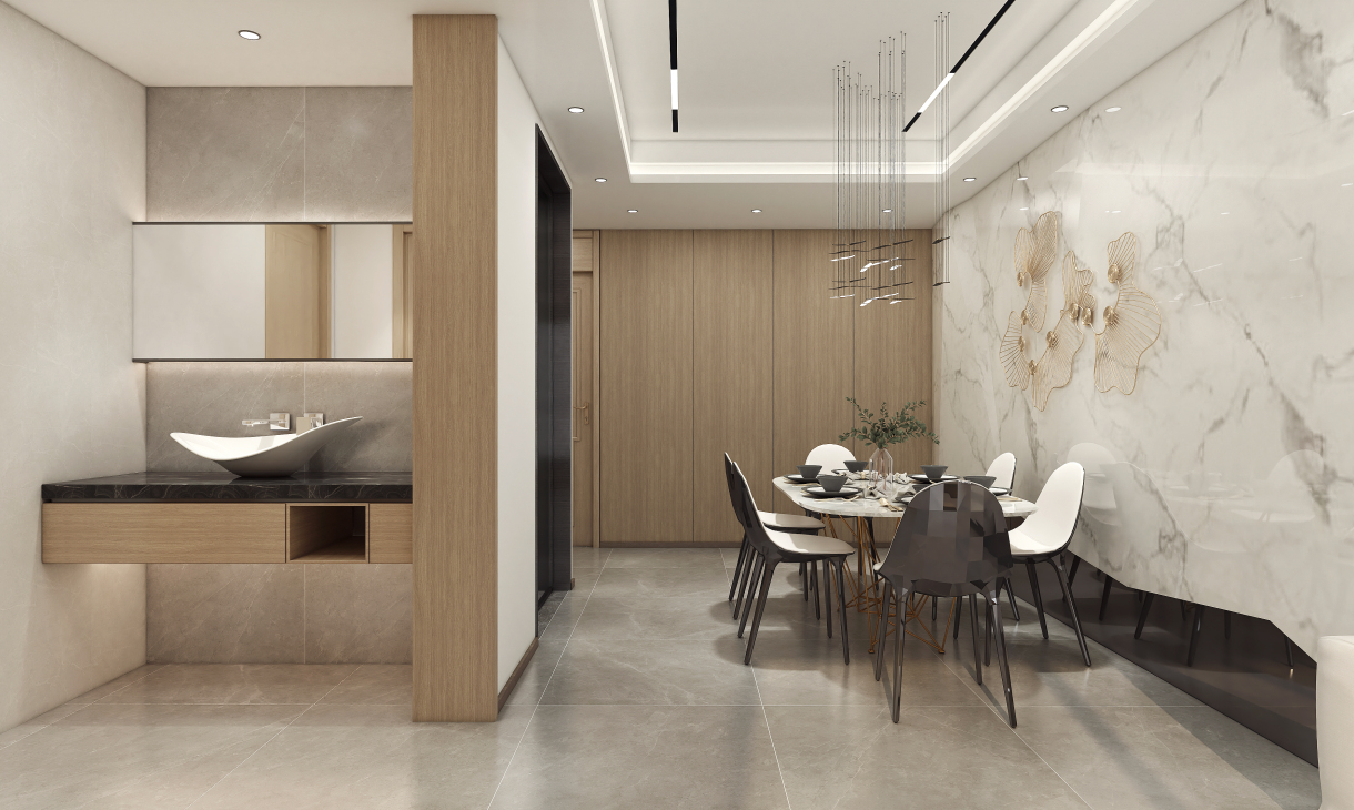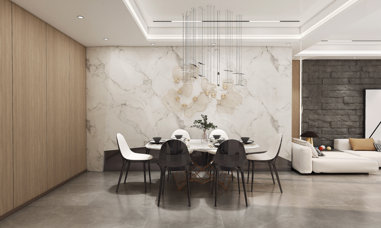 餐桌之上,煙火人生,餐廳延續(xù)客廳的整體格調(diào),木質(zhì)的餐桌增加質(zhì)感,不同深淺的餐椅呼應整體空間色調(diào),光澤的條形吊燈懸于餐桌之上,輕松打造內(nèi)斂輕松的現(xiàn)代簡約風,區(qū)別于過多色彩搭配而產(chǎn)生的審美疲勞。