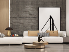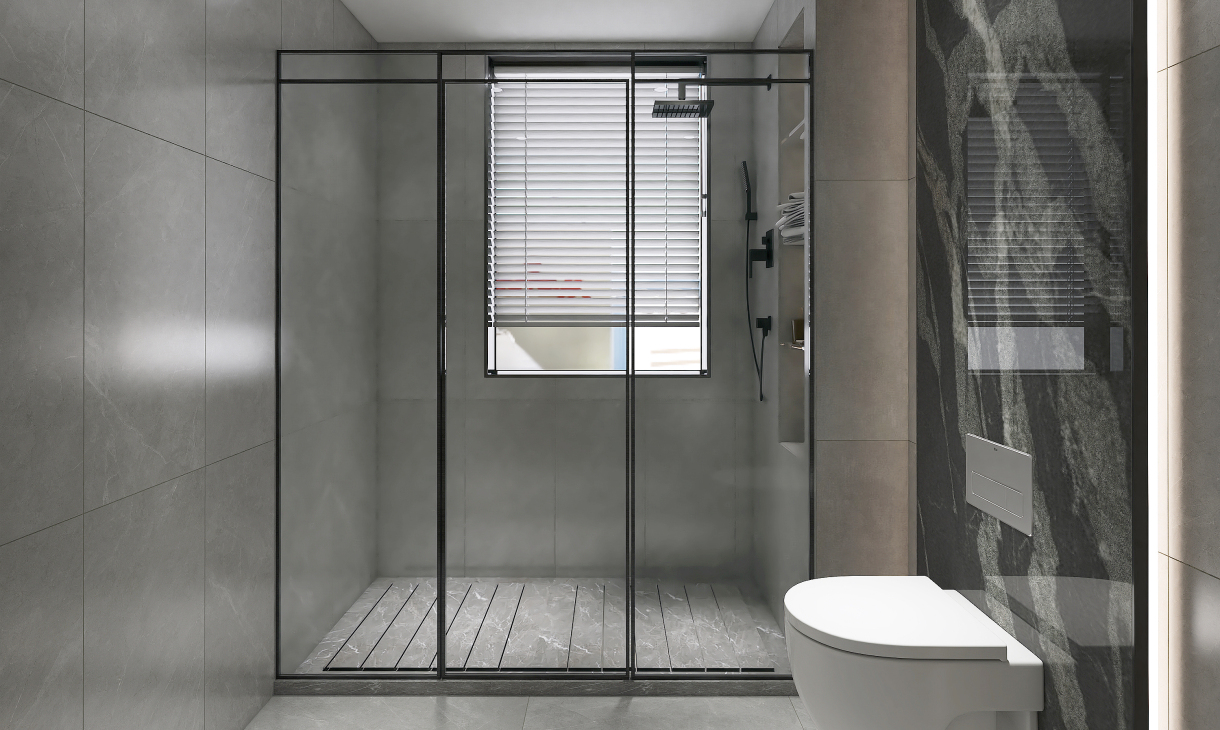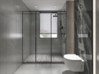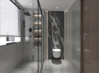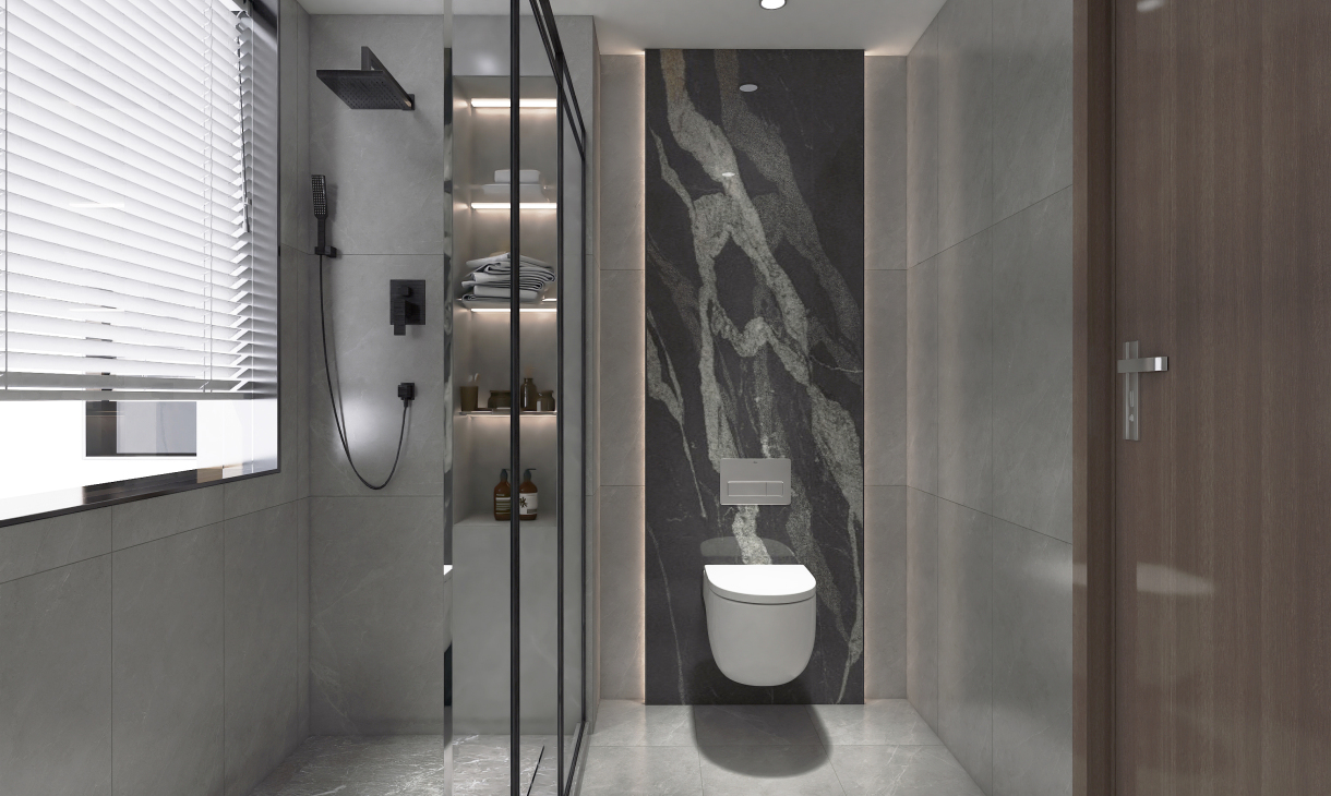 衛(wèi)生間的配色非常有現(xiàn)代主義雜志風的既視感,墻面和地面采用個性的灰色柔面瓷磚鋪貼,馬桶背景黑色巖板背面暗藏燈帶,自帶高級格調(diào),時尚不失品味。