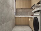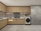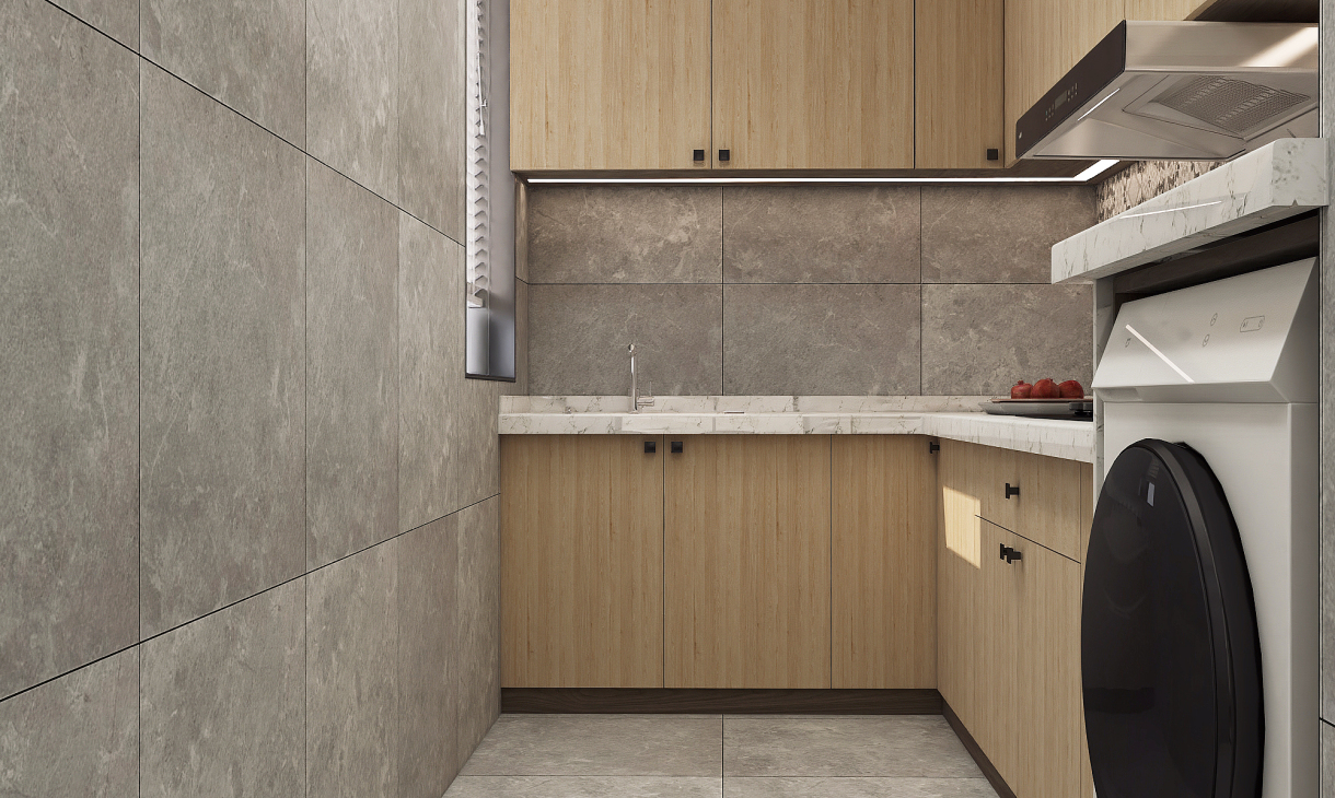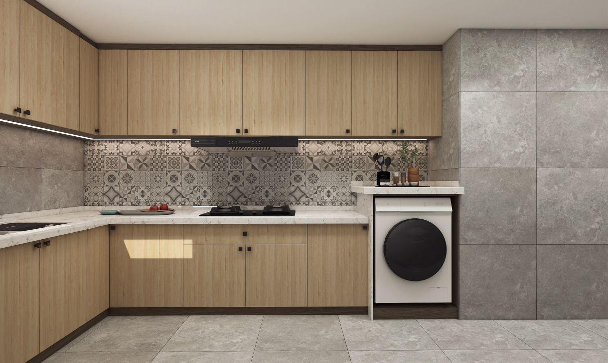 廚房之內(nèi)以功能為主,木色的櫥柜搭配灰色亞面瓷磚,在灶臺中間用花磚進行點綴,優(yōu)雅而不失大方