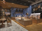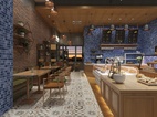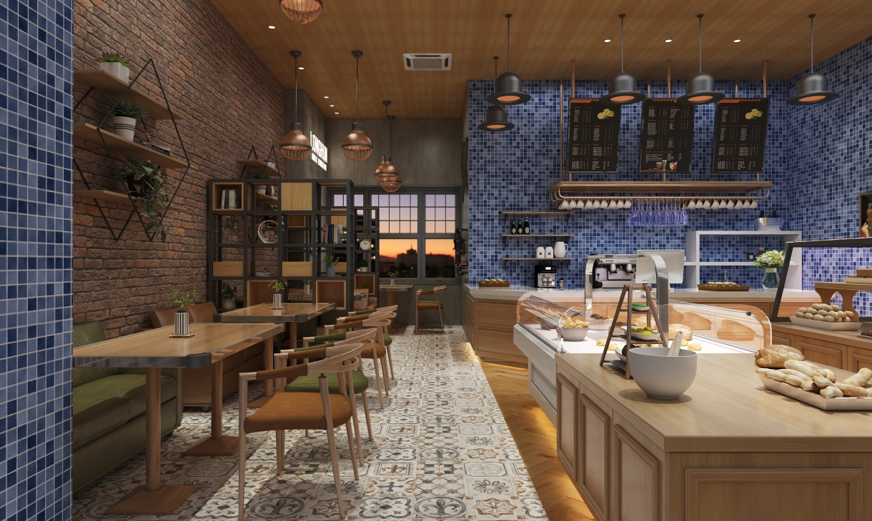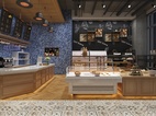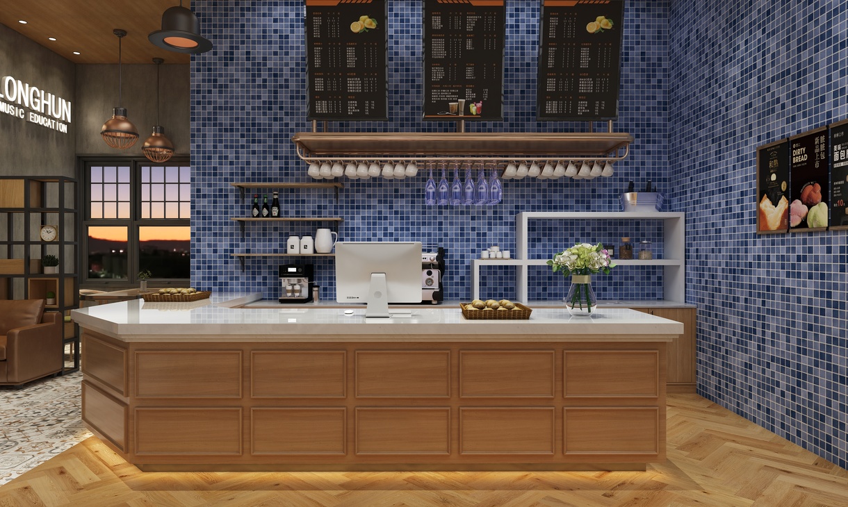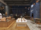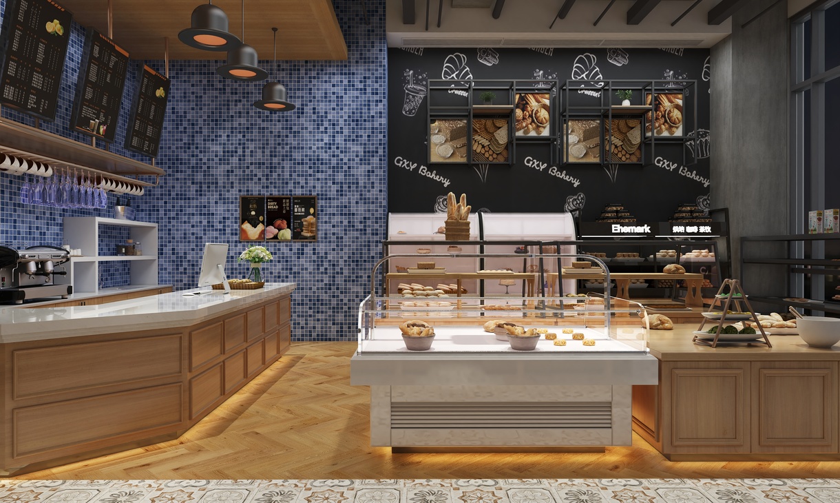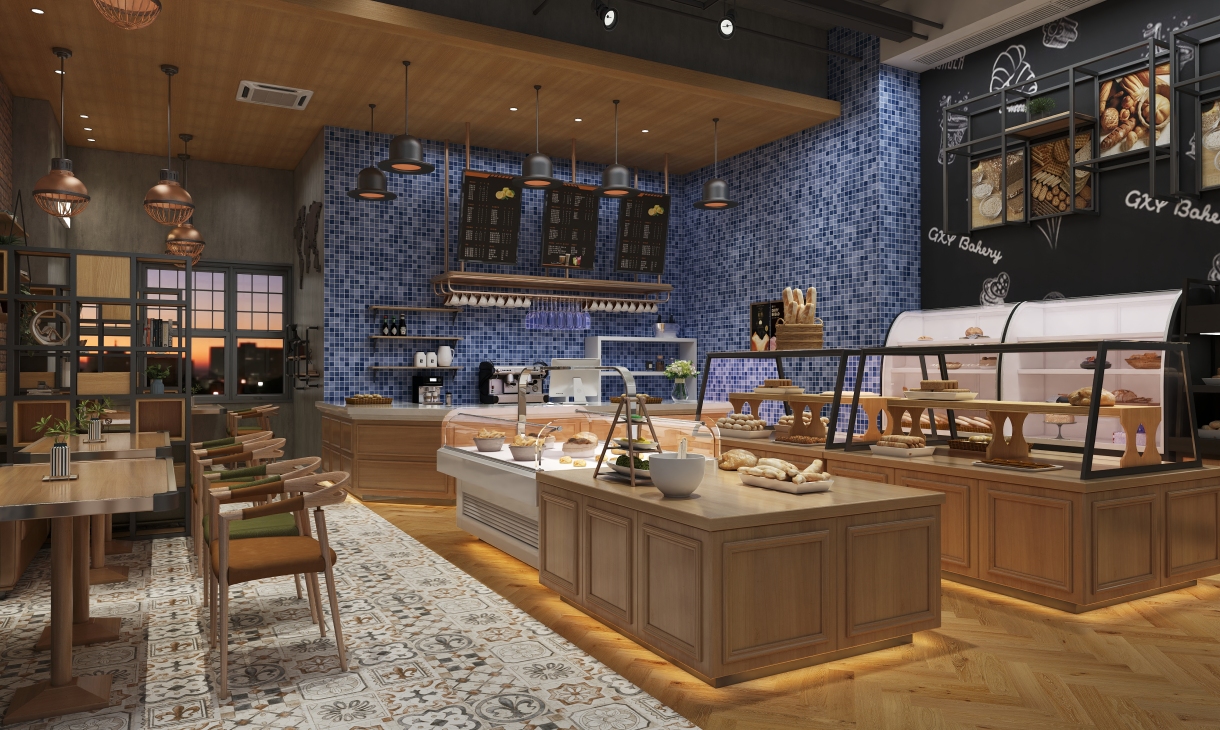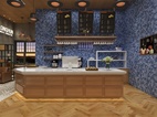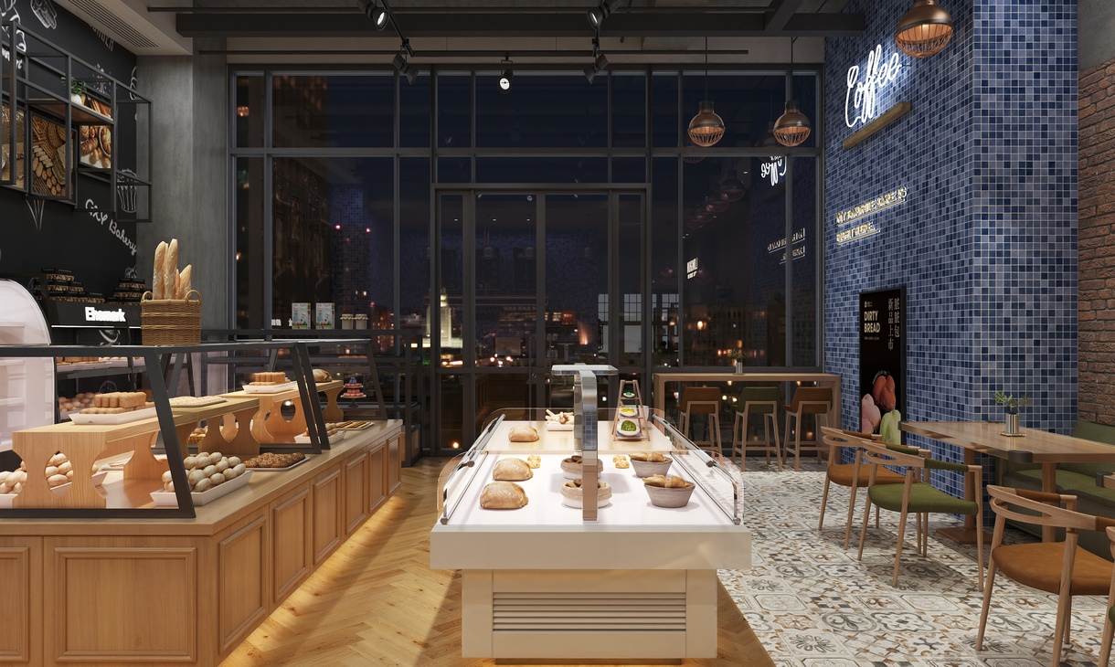 店鋪主打客戶形象,吧臺(tái)與店內(nèi)設(shè)置形成了一個(gè)巨大的整體,顯得更加簡(jiǎn)潔大氣,突顯了整個(gè)店的純樸工業(yè)氛圍。昏黃的燈光顯得面包更加的馨香。L型的長(zhǎng)條吧臺(tái),方便隨時(shí)取餐。