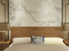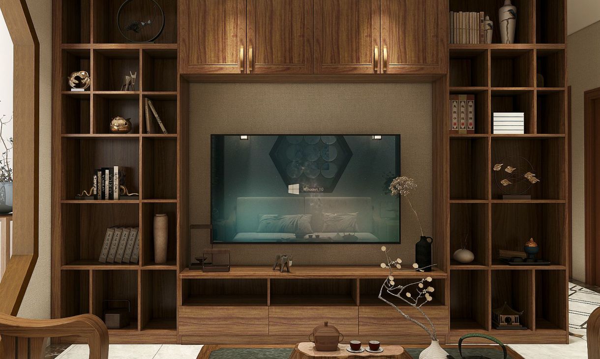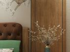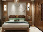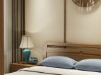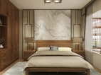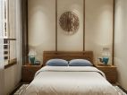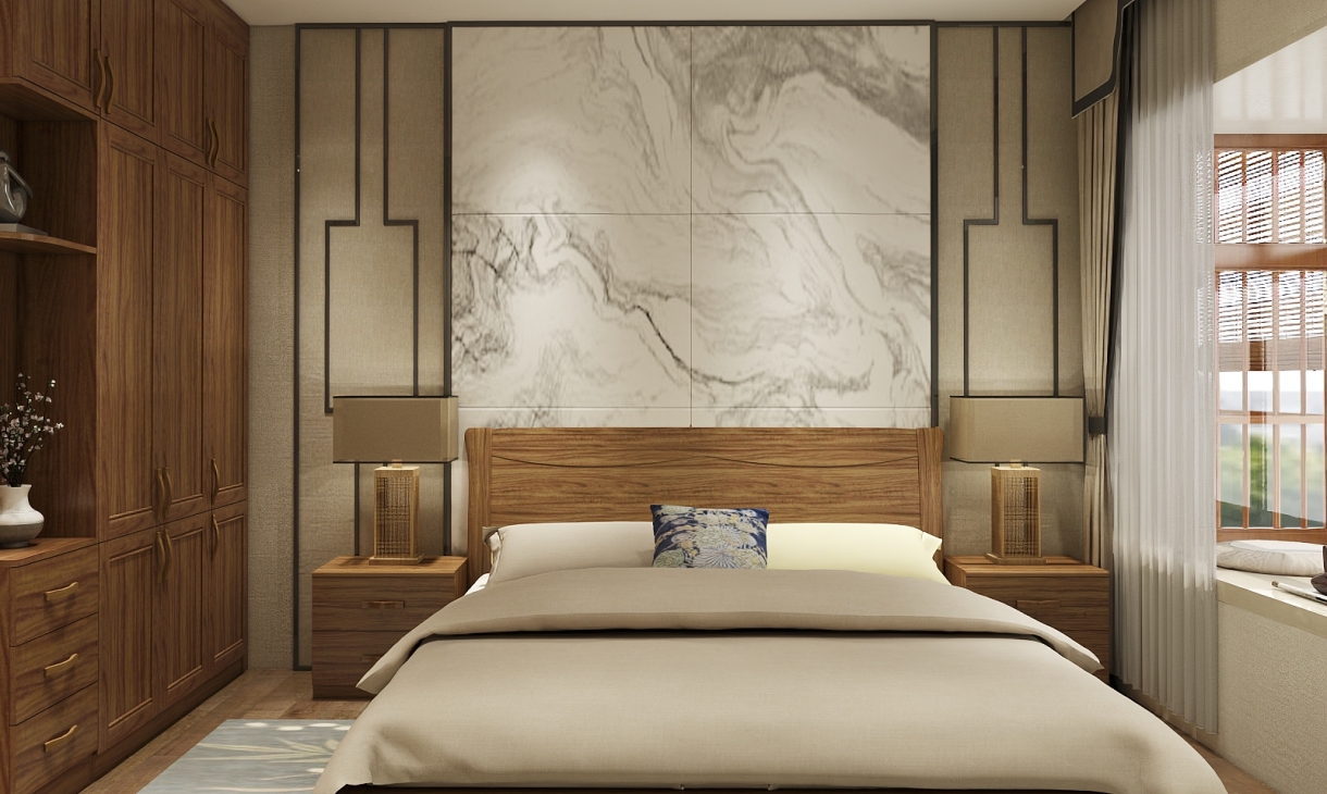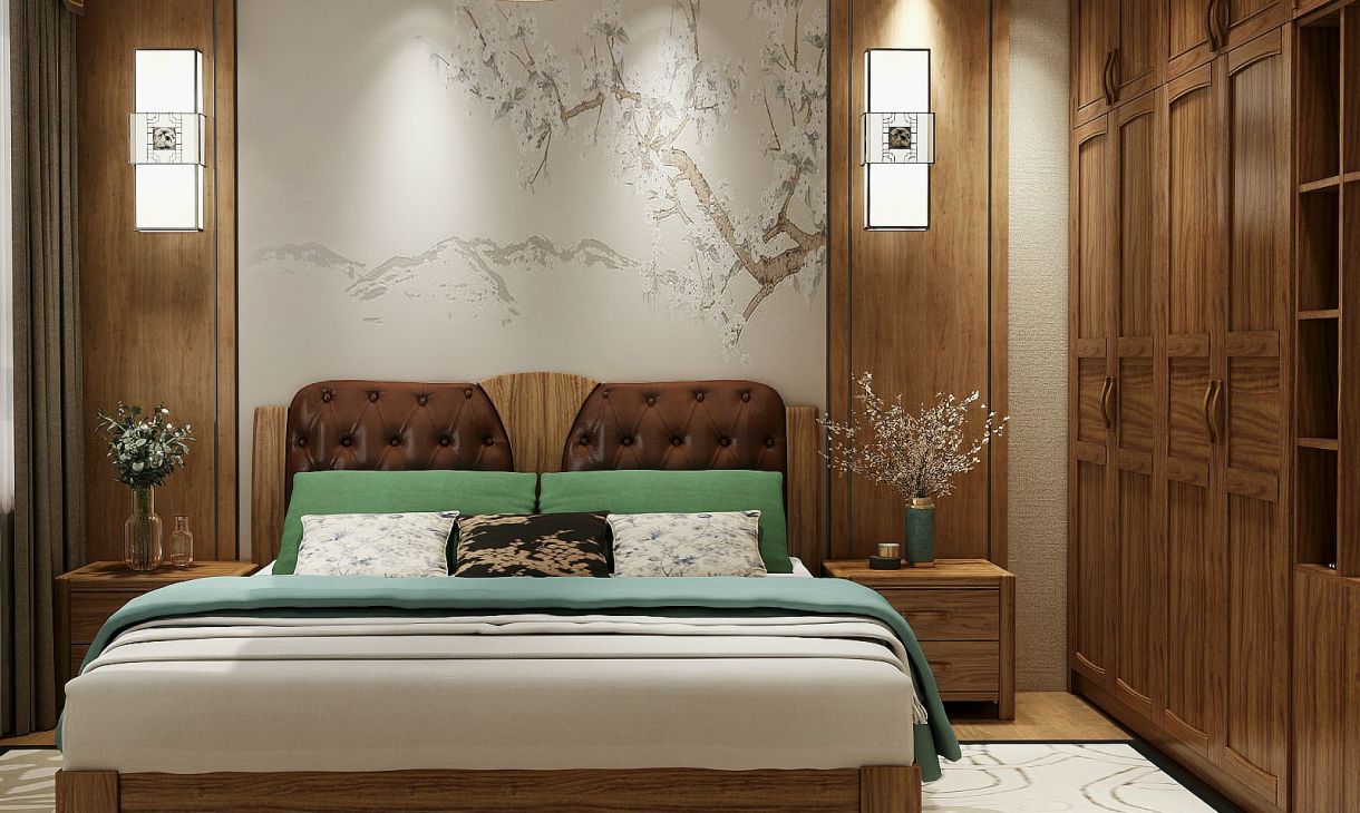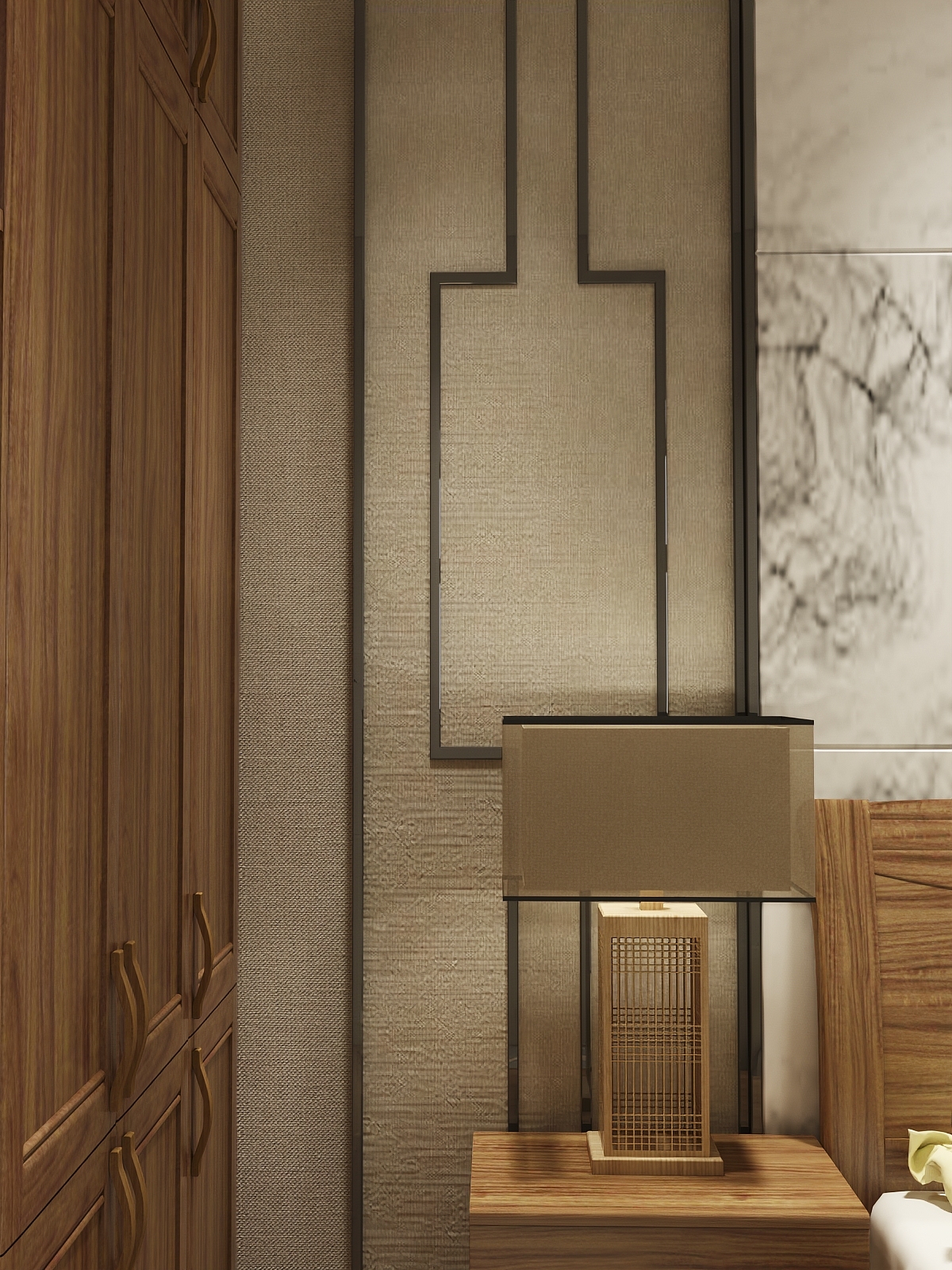 木質(zhì)背景墻加富有中國風(fēng)的畫將中式風(fēng)襯托的淋漓盡致,衣柜都采用拼框式門板,樣式復(fù)古有韻味