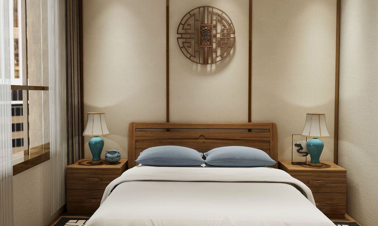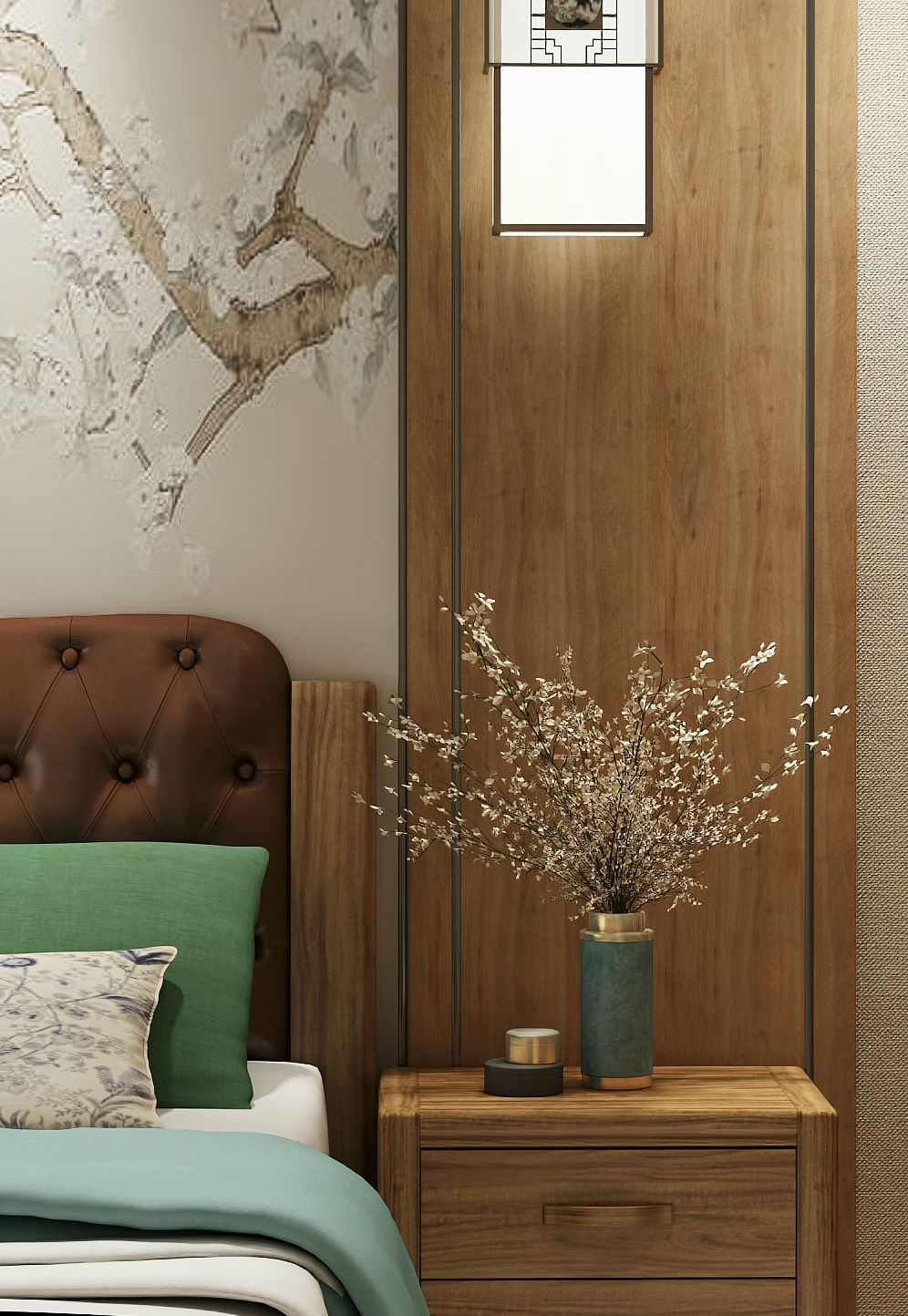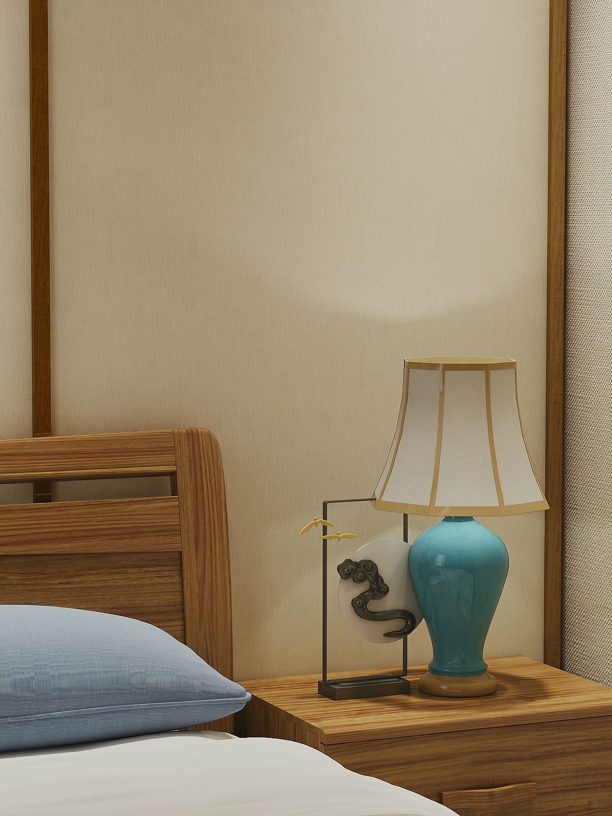 中式講究的就是對稱,所以床頭柜放了兩只臺燈,中間墻飾起到了點(diǎn)綴的作用
