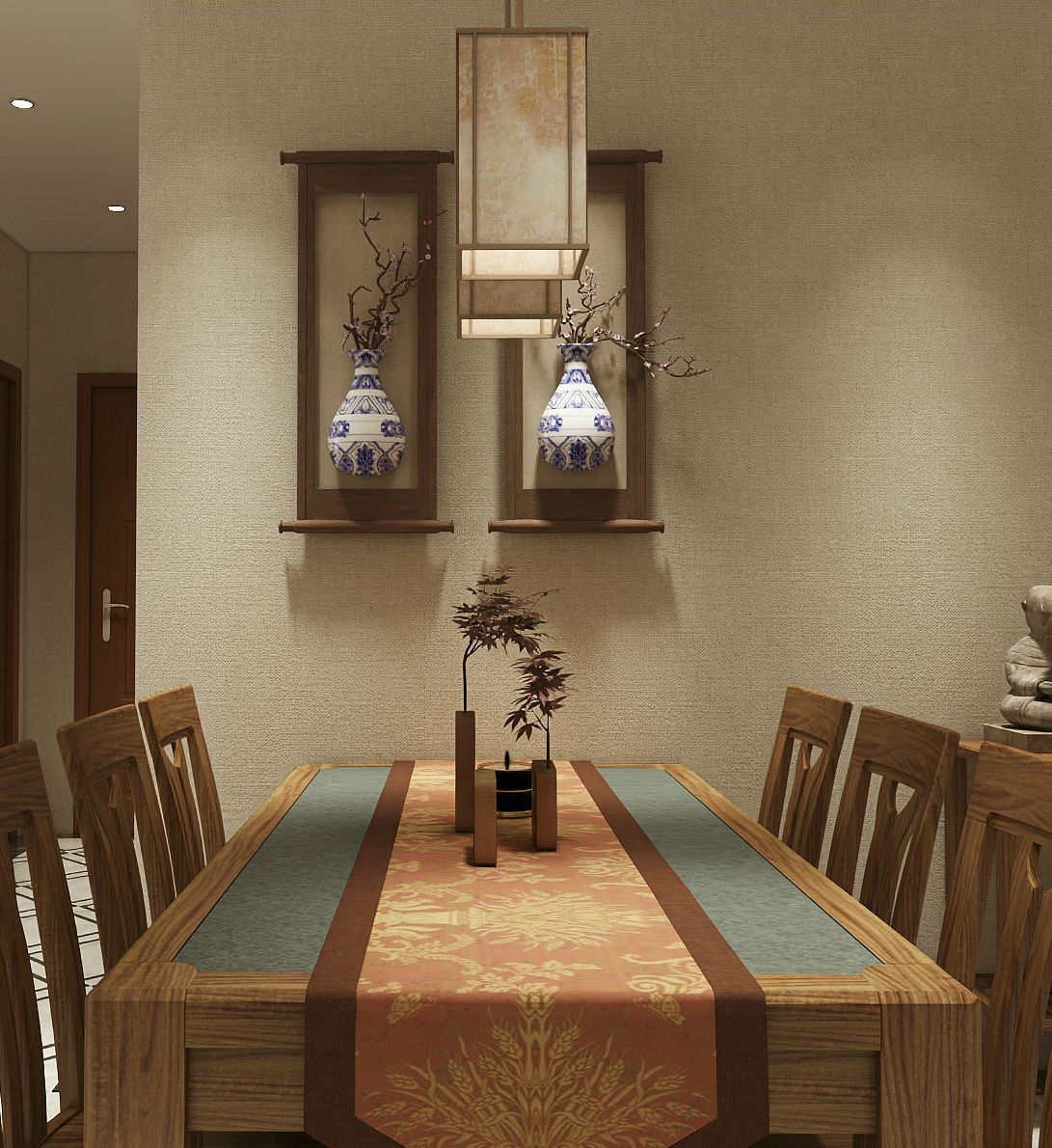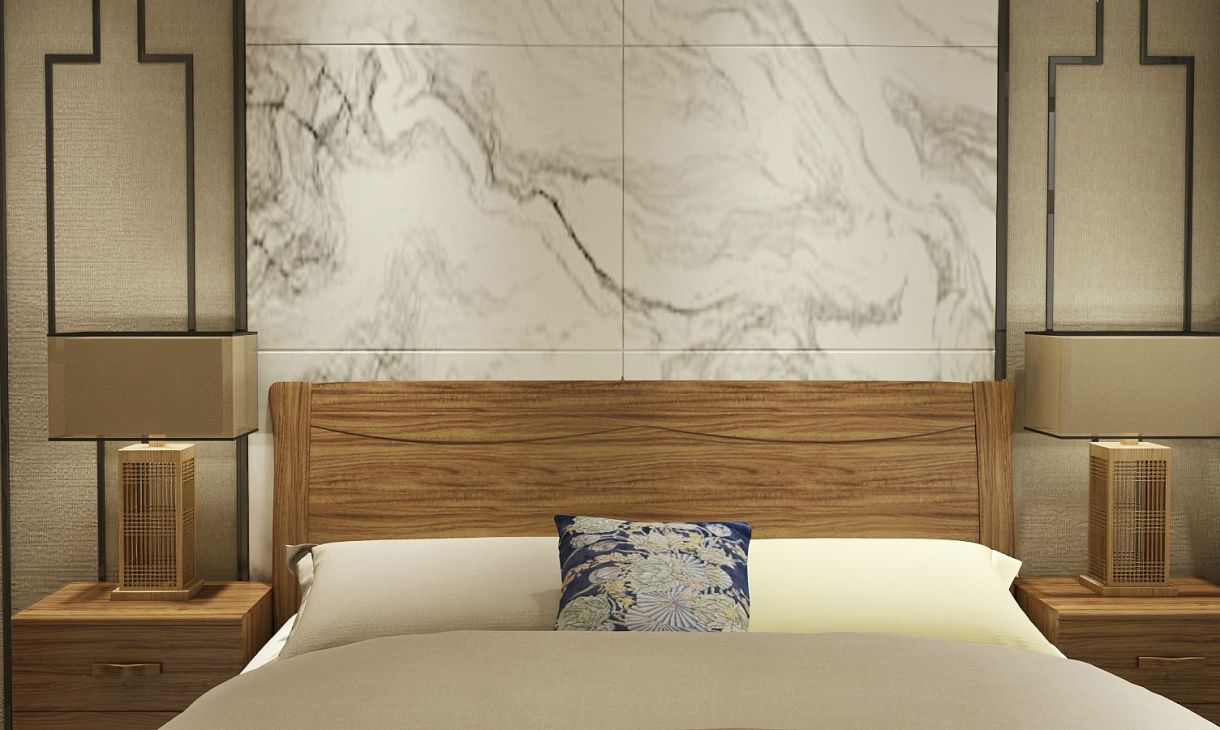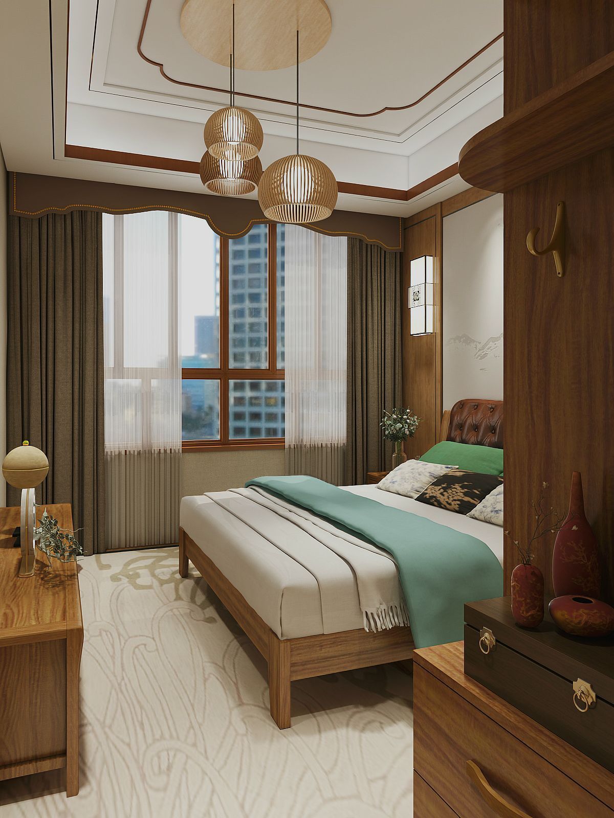 中式講究的就是對稱,所以床頭柜放了兩只臺燈,中間墻飾起到了點(diǎn)綴的作用