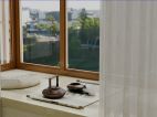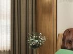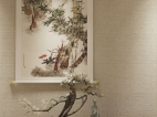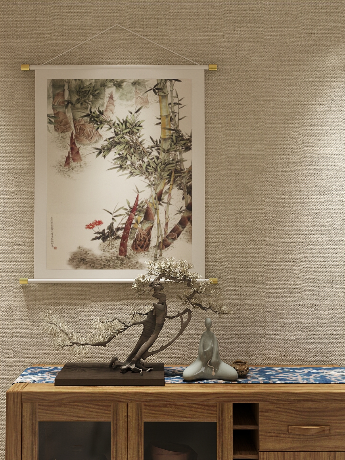 餐桌對面置一餐柜,畫與盆景又組成一幅新的畫面,古樸有韻味。