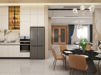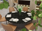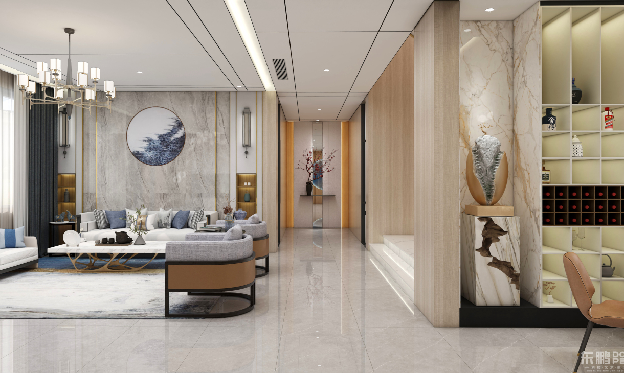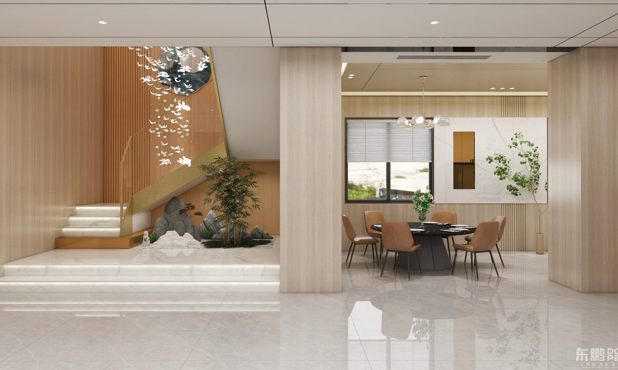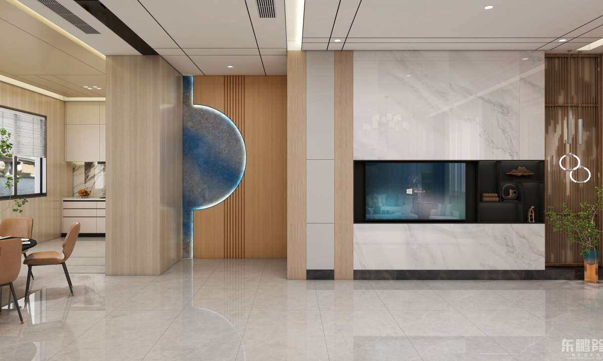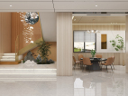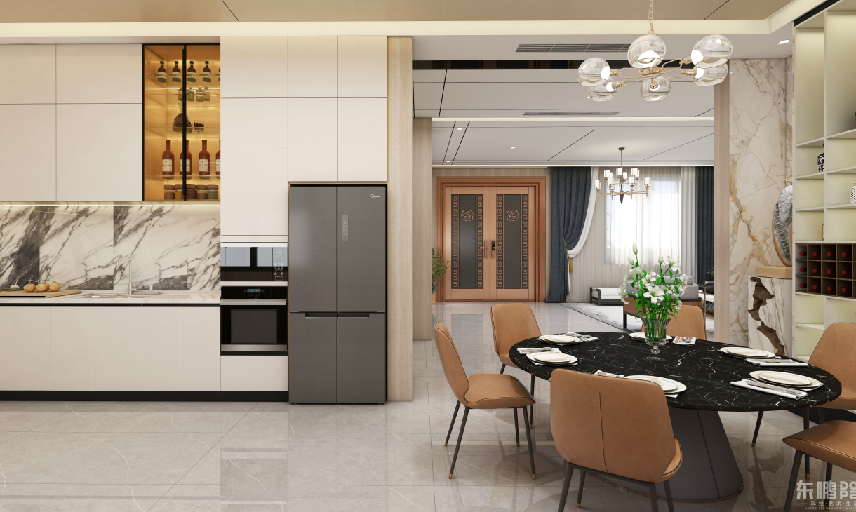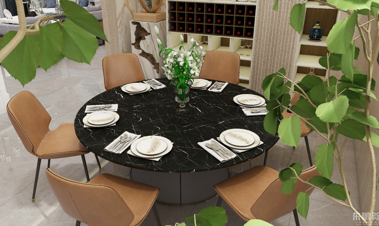 餐廳返景入林,綠植點綴,通透琉璃吊燈,一幅林間美景。深色線條與淺色基調(diào)形成強烈的對比,增強了空間的視覺張力。富有自然肌理感和溫潤質(zhì)感的大理石,搭配簡約素雅的皮革、面料,勾勒出空間低調(diào)優(yōu)雅而不失溫馨的高級氣質(zhì)。