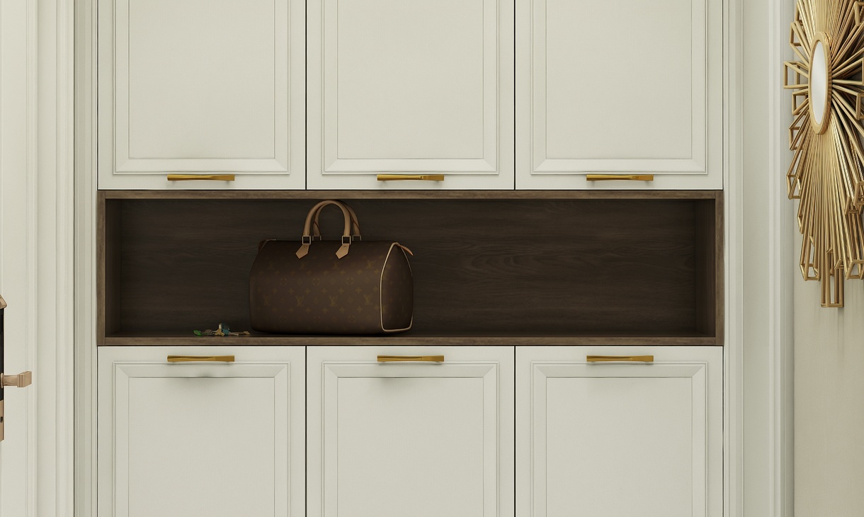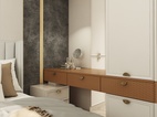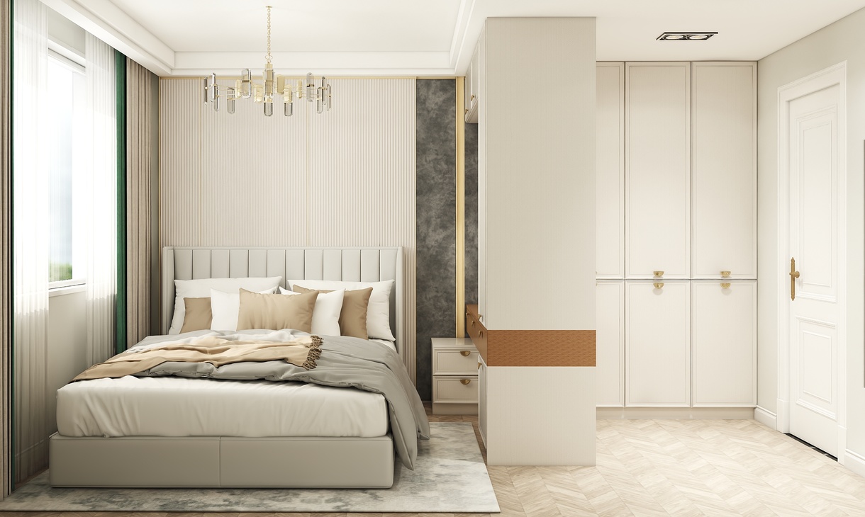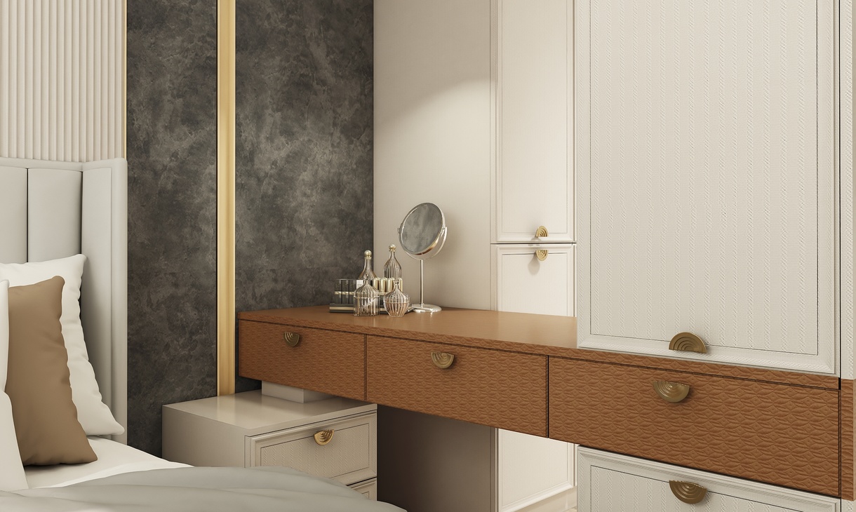 輕奢美式風(fēng)格,主臥內(nèi)有衛(wèi)生間,不想床對(duì)著衛(wèi)生間門,巧妙利用柜體與搭建梳妝臺(tái)結(jié)合擋住衛(wèi)生間門