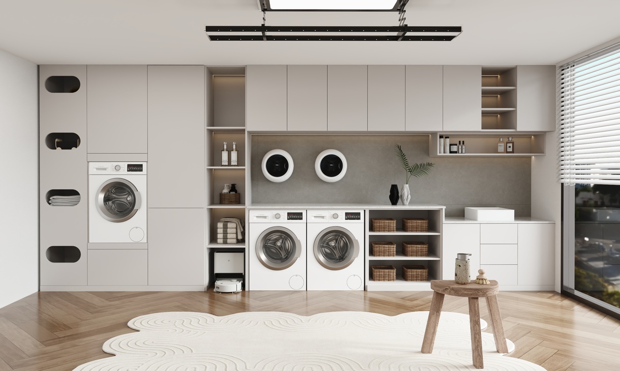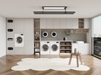陽(yáng)臺(tái)一體柜整體設(shè)計(jì),包含洗漱柜 洗衣機(jī)柜 收納柜 高低臺(tái)面