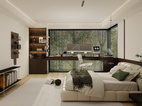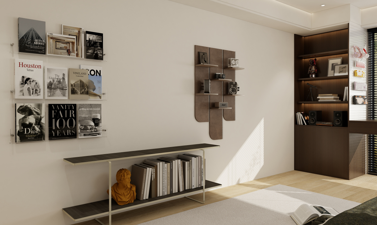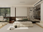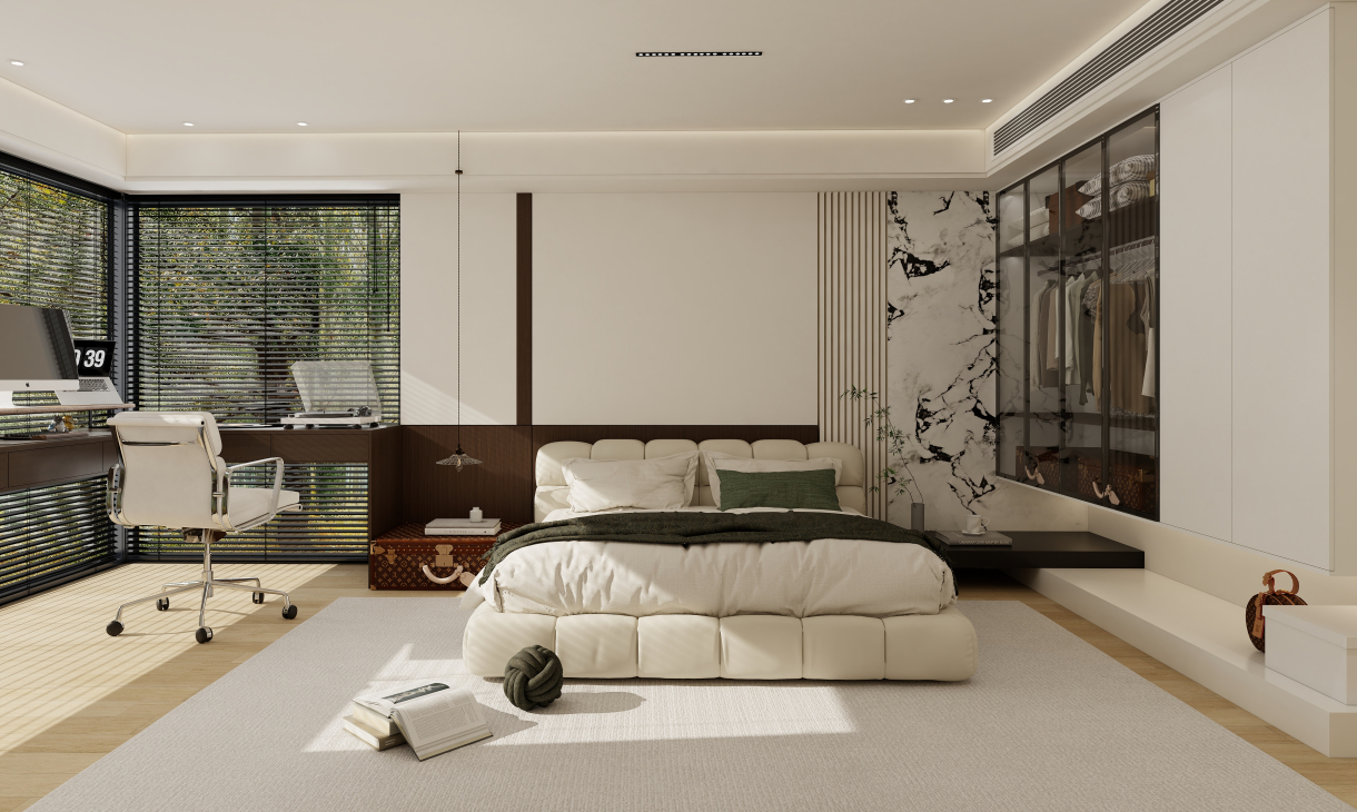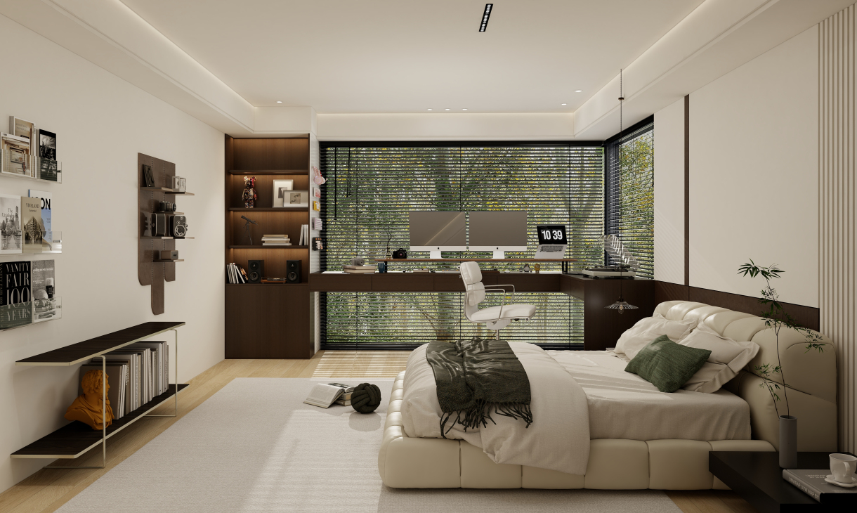 這間臥室以現(xiàn)代簡(jiǎn)約風(fēng)格為主,整體墻面采用溫和的中性色調(diào),與深色木質(zhì)元素相結(jié)合,溫暖的色調(diào)與簡(jiǎn)約的線條相得益彰,營(yíng)造出一個(gè)恬淡且靜謐的空間。