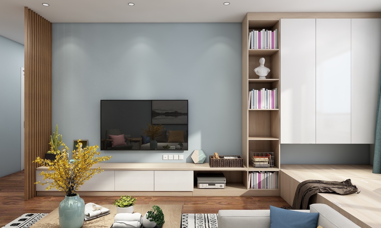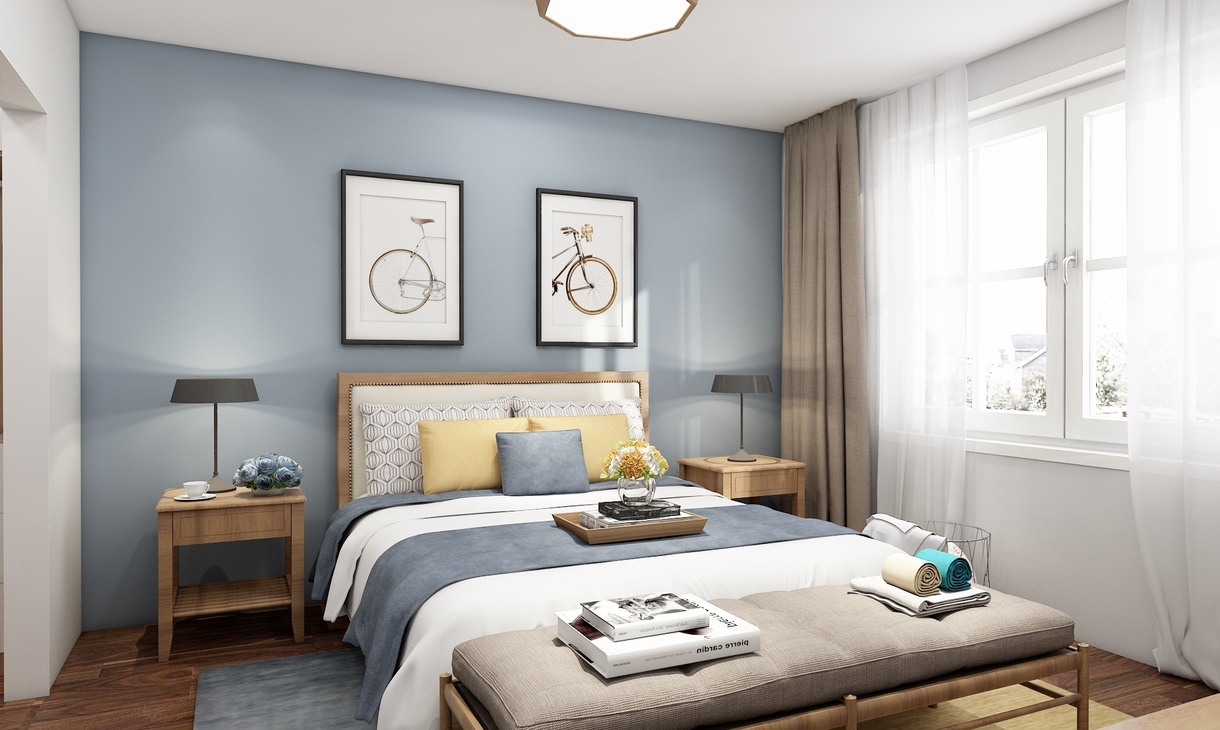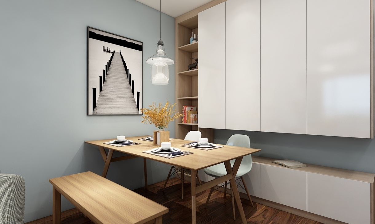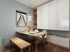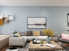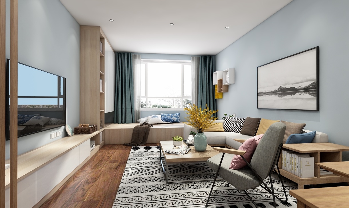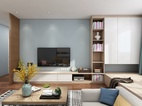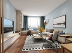 本案圍繞著簡約、靜謐這兩個(gè)特點(diǎn)來設(shè)計(jì),藍(lán)灰色與原木的搭配,原木色的溫馨,中和了藍(lán)色的冷感,空間的格調(diào)變的更自然,也更有家的溫馨舒適。