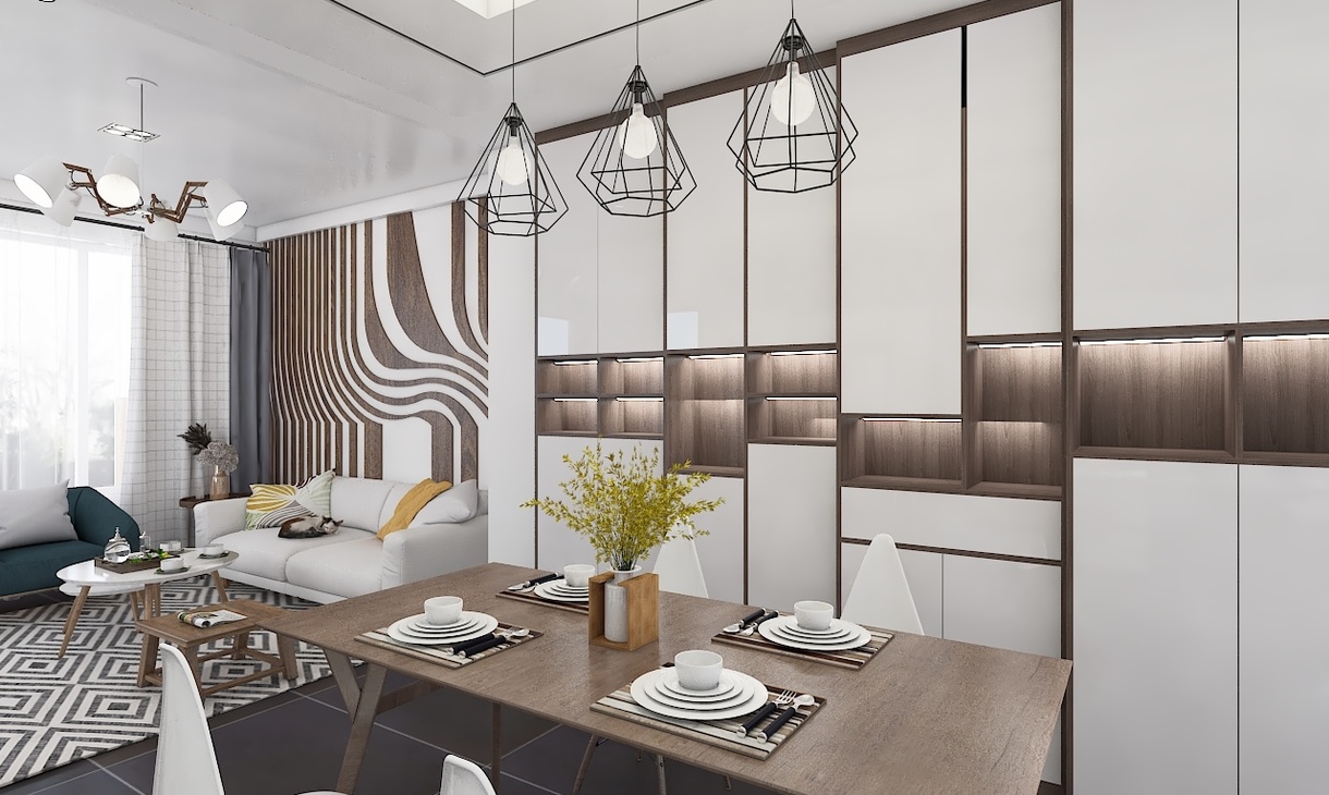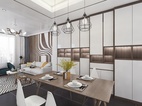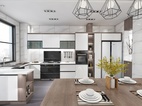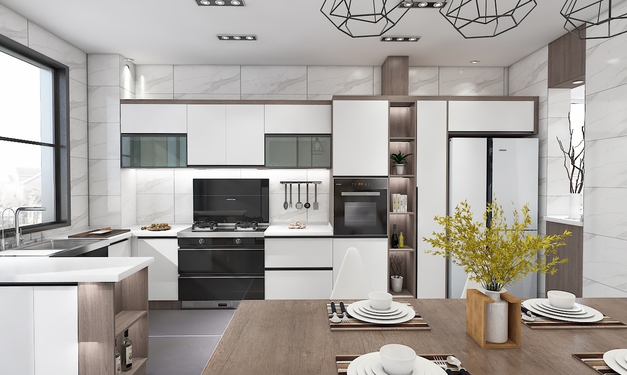 開放式的廚房的空間,使廚房和餐廳很好的融合在了一起,減少了空間的隔斷,從而使整個家更加的明亮開闊。原木色柜體加白色高光門板,顯得整個空間更加簡潔大方,部分采用燈帶以及黑框玻璃門點綴,簡約而不簡單,