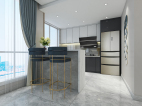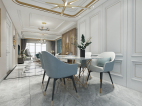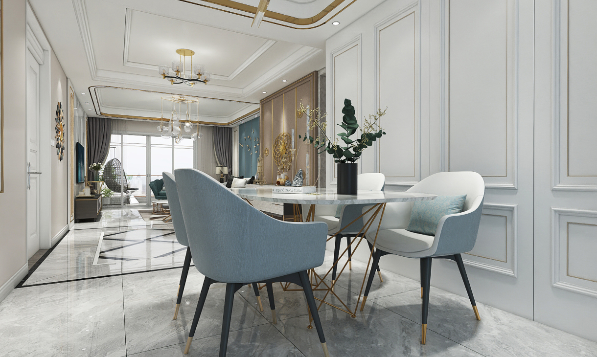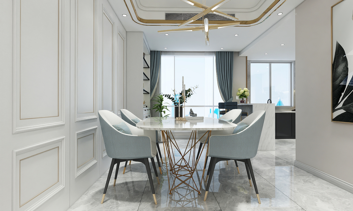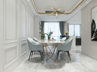 餐廳與客廳相連,通過玄關地花來區分空間,沒有太多柜體,簡單餐桌就夠了。