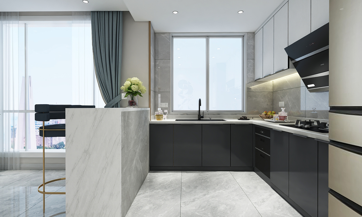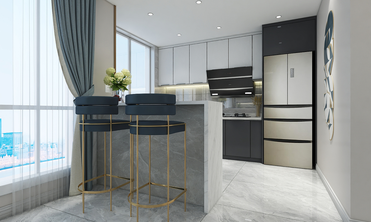 簡潔大方的廚房顯得既不局促又實用性強。吧臺能夠在視覺上有效地增大開間。
