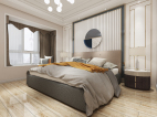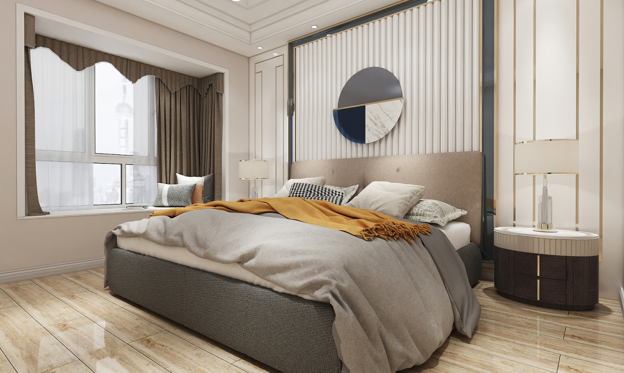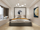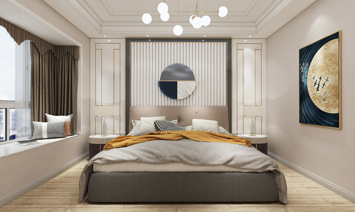 通過金屬吊燈以及金屬質感的造型點綴,提升了臥室的整體精致質感。