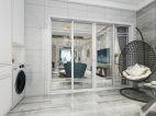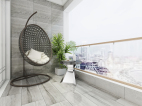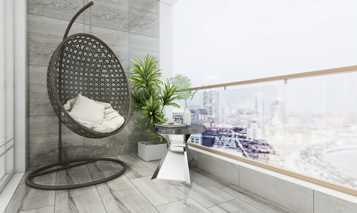 全高收納柜增加陽臺收納性。木紋磚低調卻又親近自然,同時也呼應了整體搭配風格。