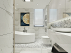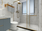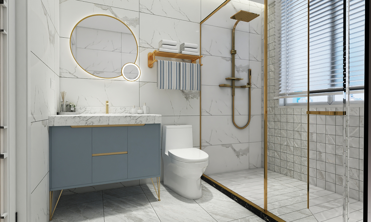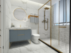 藍色浴室柜,圓形鏡子打破了整體空間的沉悶,讓黑白灰的小空間里也變得格外精致。