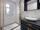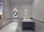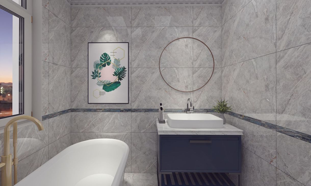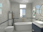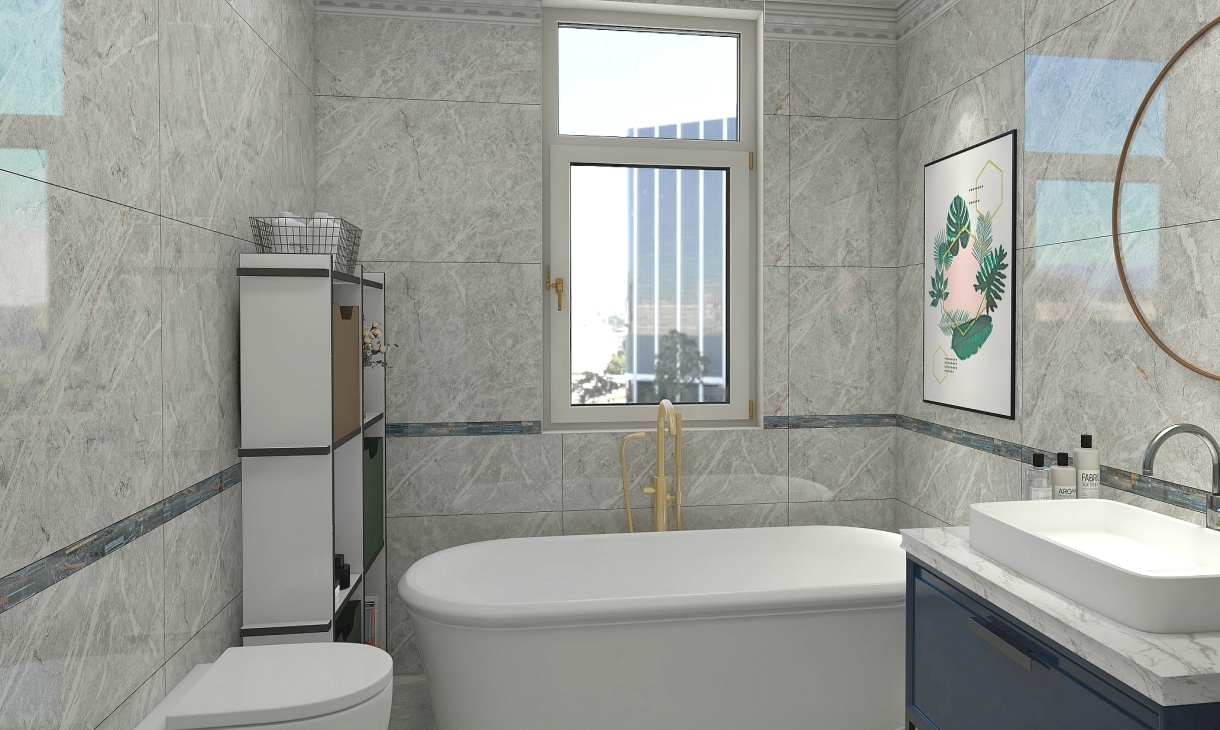 主衛(wèi)用亮灰色的主色調(diào),搭配和客廳相呼應(yīng)的藍虎眼石瓷磚做腰線,使得整個家居空間顏色可以融合貫通,在變化中高度統(tǒng)一。