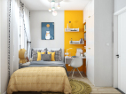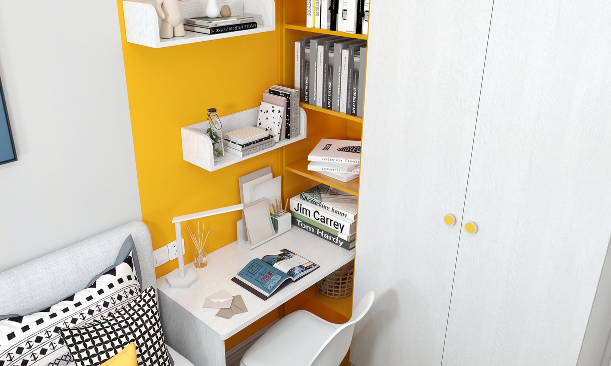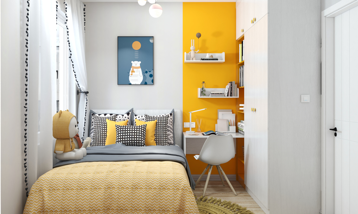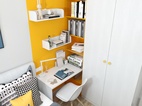 衣柜上的規劃上,借助小孩房的衣柜延伸出學習區。吊柜的設計,從小培養小孩分區整理收納的習慣,讓思維更加活躍。