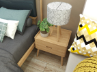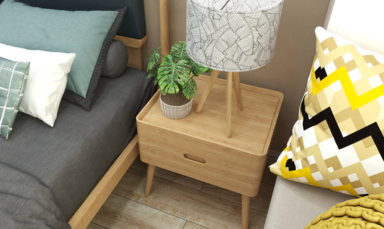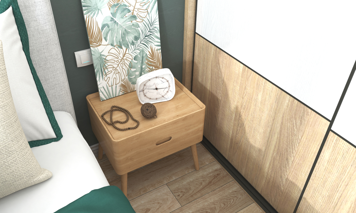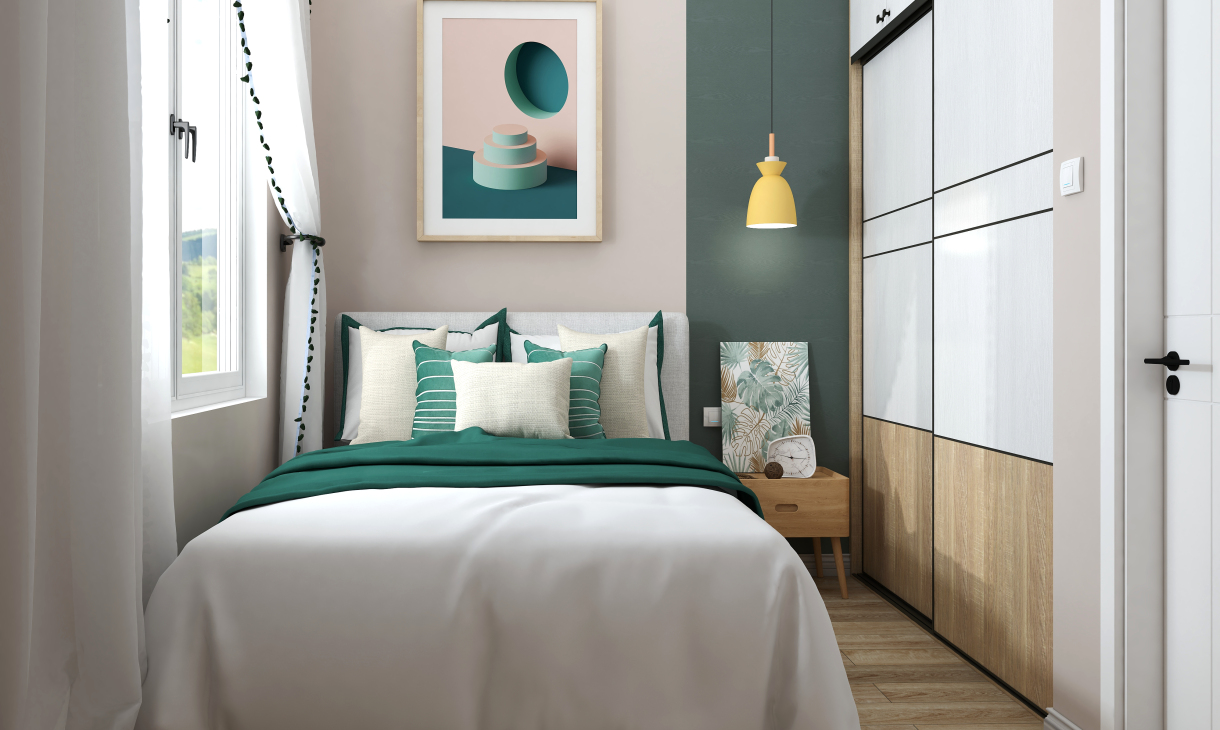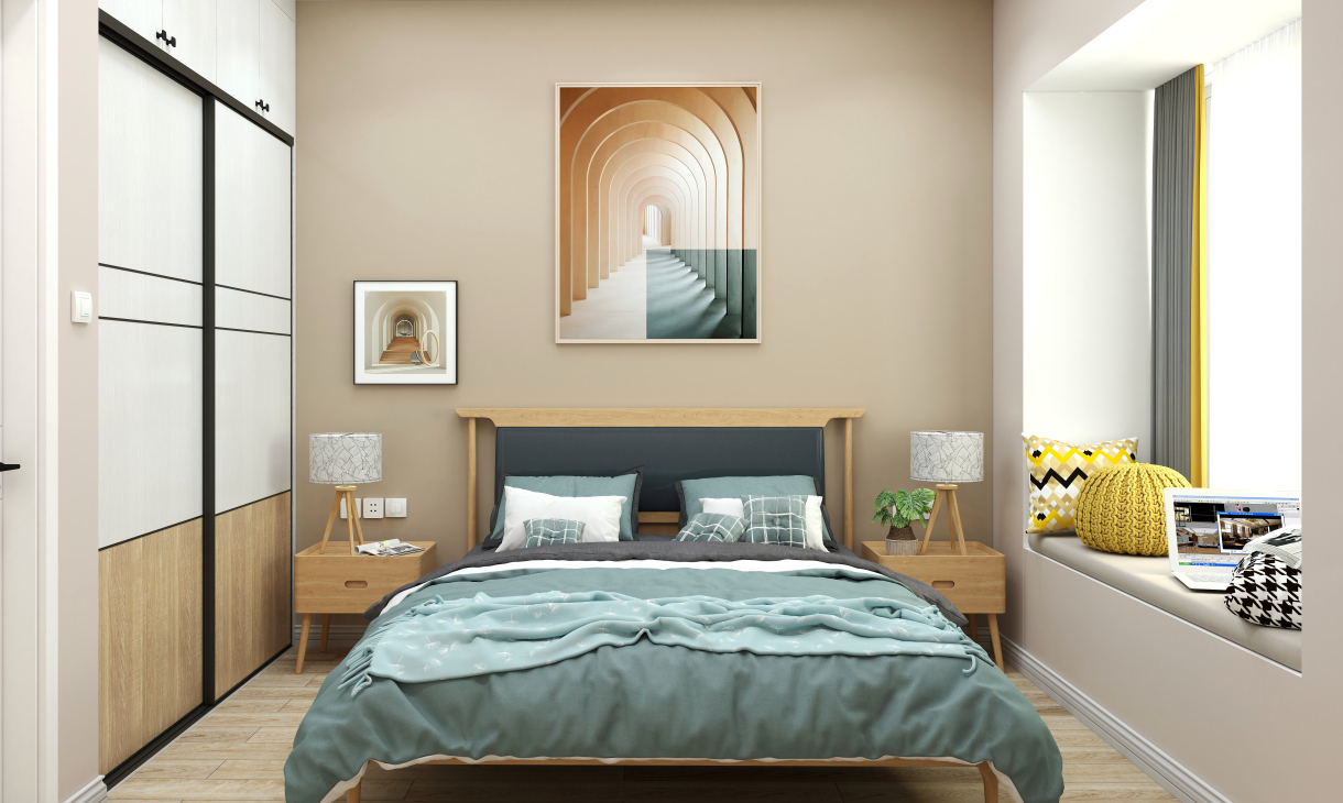 臥室同樣延續了客廳暖色為主調的設計,配上原木床頭和家具,讓空間多了北歐樸質;而淺灰色色的窗簾,搭配冷色床品,讓空間充分時尚活力,充分體現業主的品味及青春。