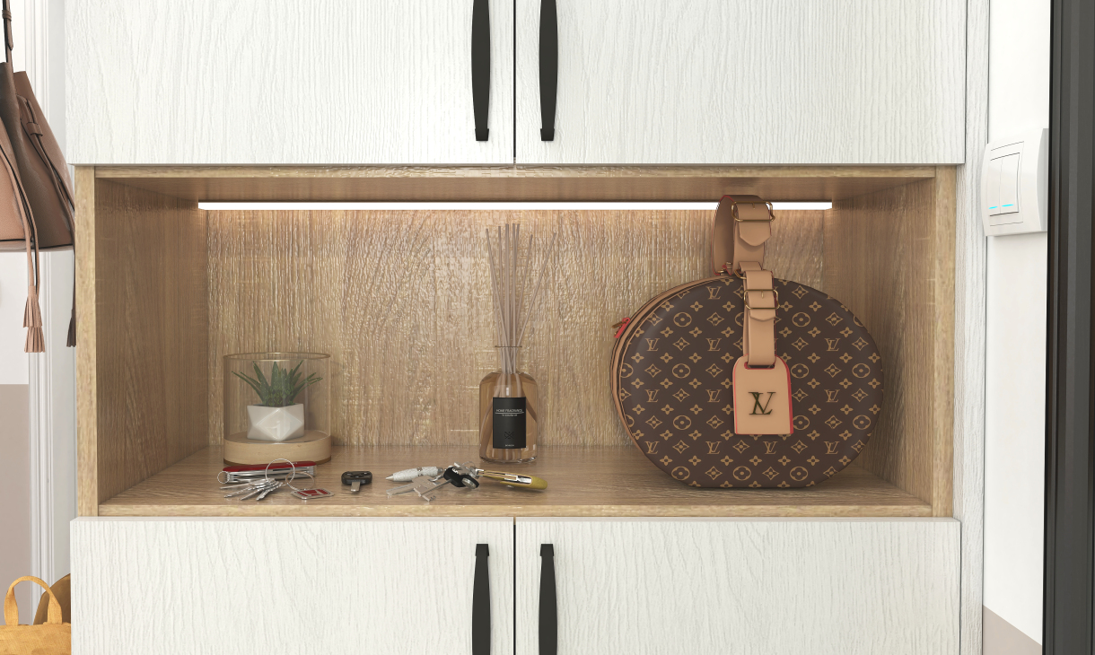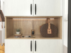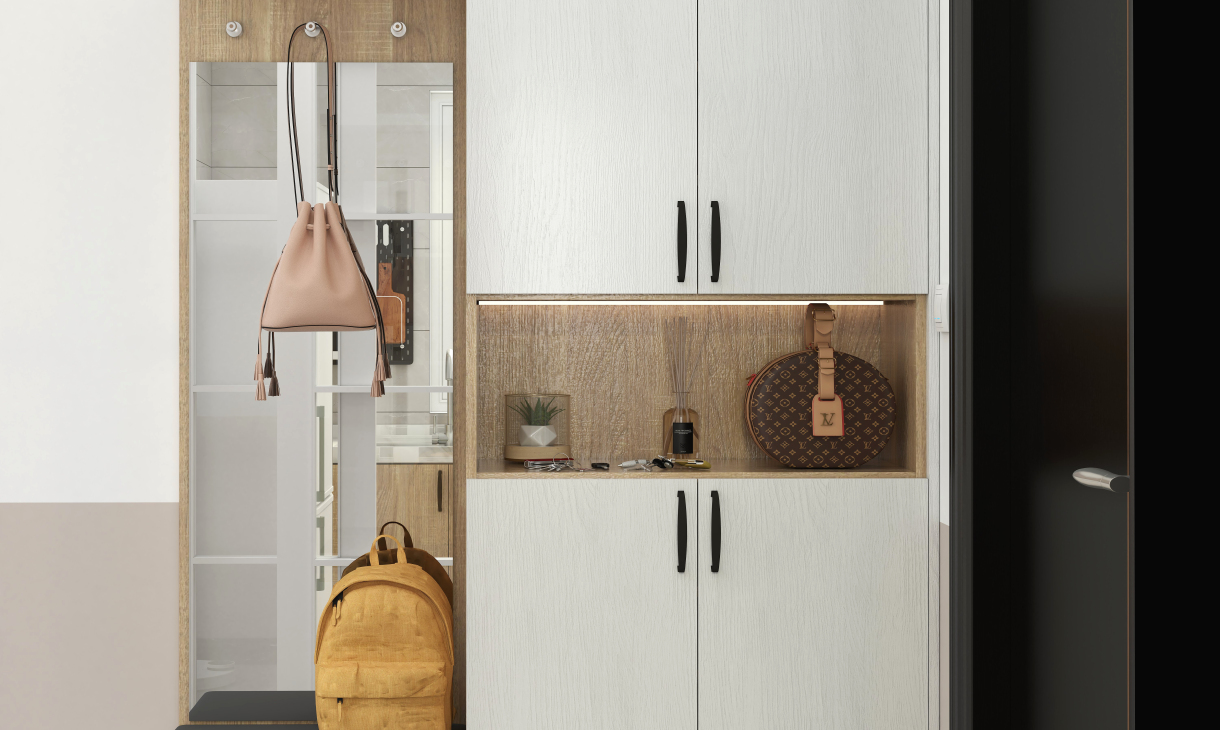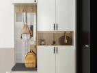 入戶定制到頂的鞋柜,底部留空方便放置一家人常穿的鞋,還能充當換鞋凳的作用,方便老人孩子坐下換鞋。