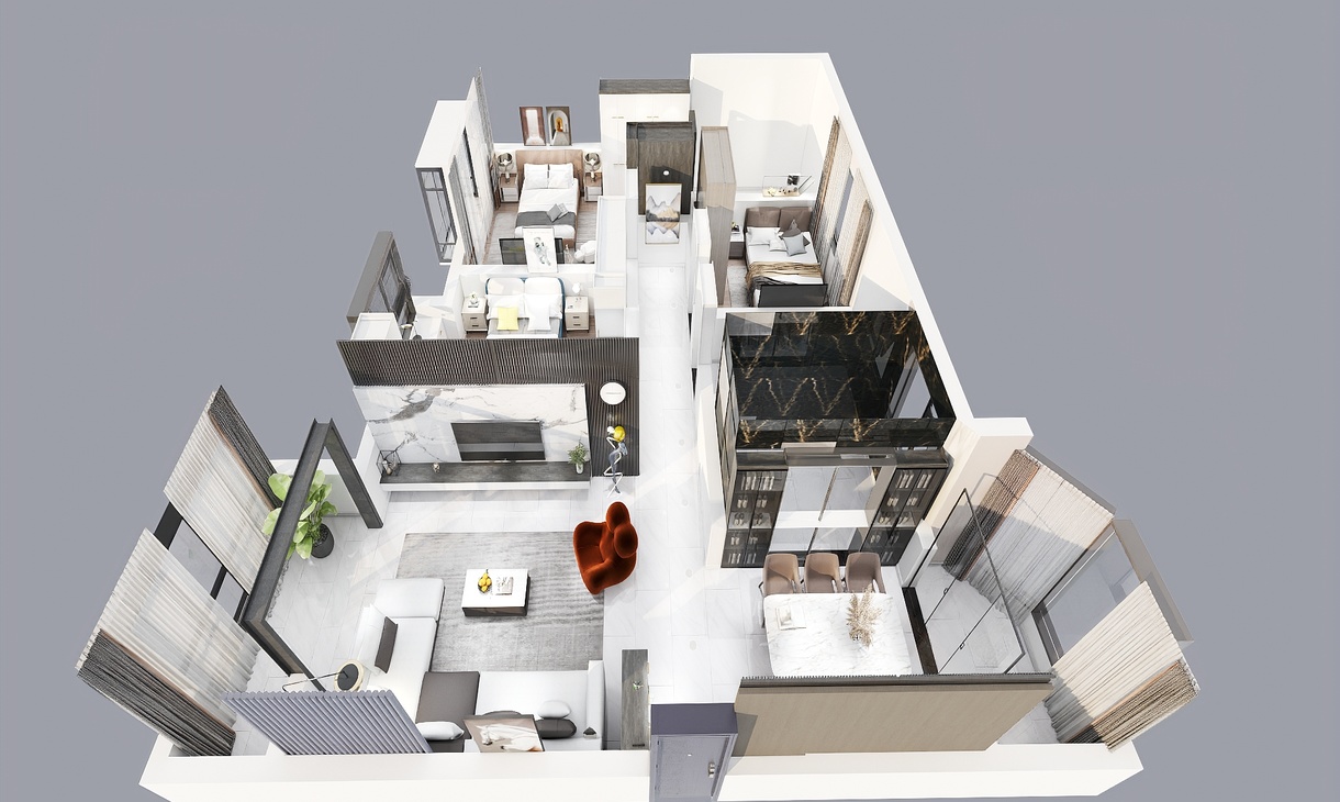 每個(gè)空間至少2張效果圖+1張全案全景圖展示,方案描述完整,所有空間需命名。