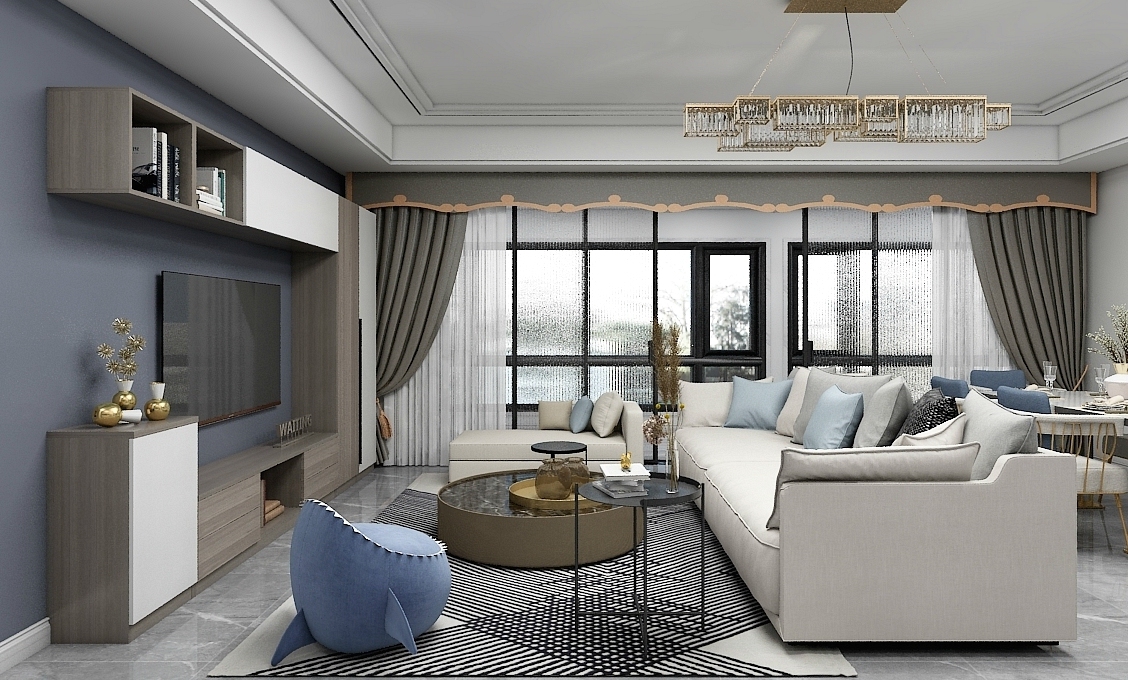 沙發(fā)背景采用灰藍(lán)色來提升整個(gè)客廳的色彩感,外邊是家的陽臺(tái),是經(jīng)常進(jìn)進(jìn)出出的地方。這樣一來,客廳布置裝修都很便利,雖然面積不大,但是 空間利用率較高。組合型的電視柜讓整個(gè)客廳空間更加豐富。