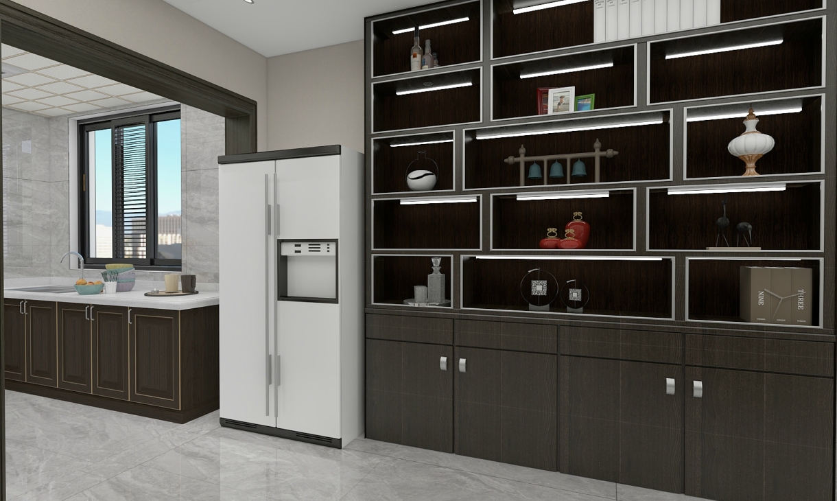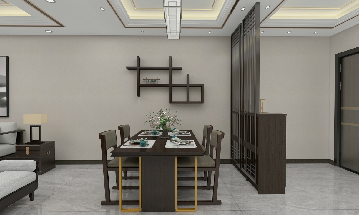 新中式家具,有品質(zhì)的簡樸,有節(jié)制的奢華,餐廳空出一面墻做一組酒柜,增加儲物空間。