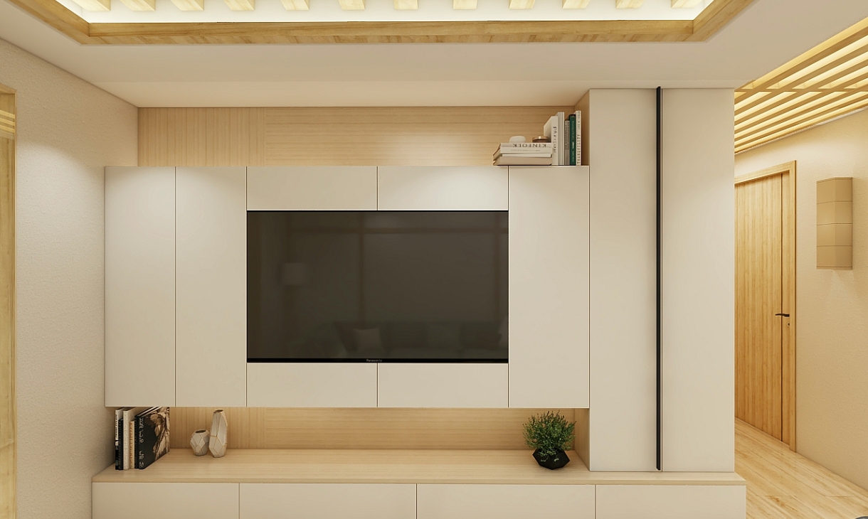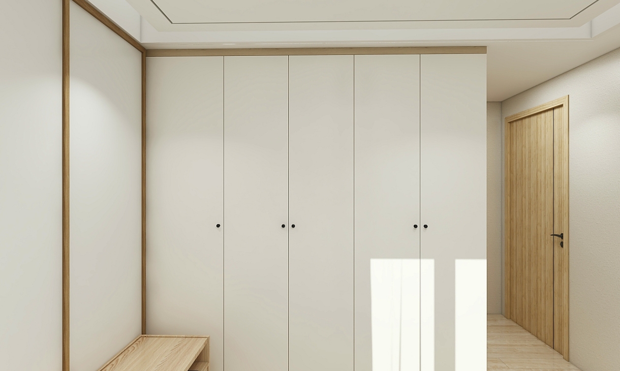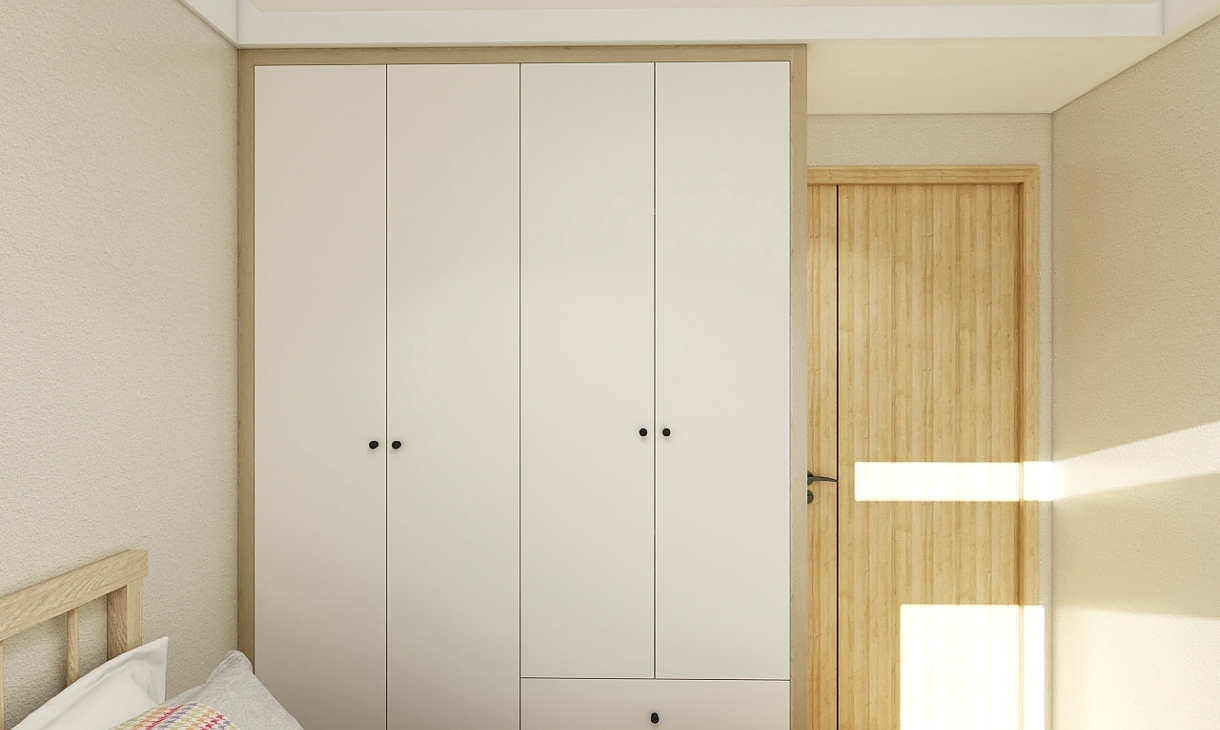 平板門的設計結合四邊的原木色收口線條,配上黑色圓拉手用來點綴整個衣柜