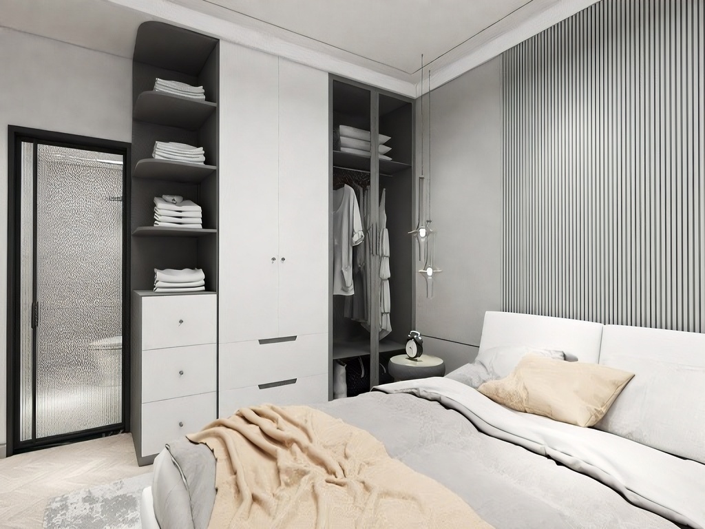 主臥空間具化為實用與美學(xué)交織相融的生命體,色彩的溫潤、線條的輕盈與布藝的質(zhì)感,結(jié)合輕奢雅致的燈光灑落其中,自成一副恬靜情境。聽聽香頌或爵士樂,享受這藝術(shù)浸潤的曼妙生活。