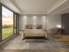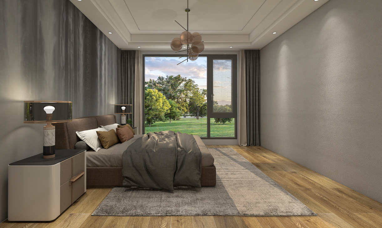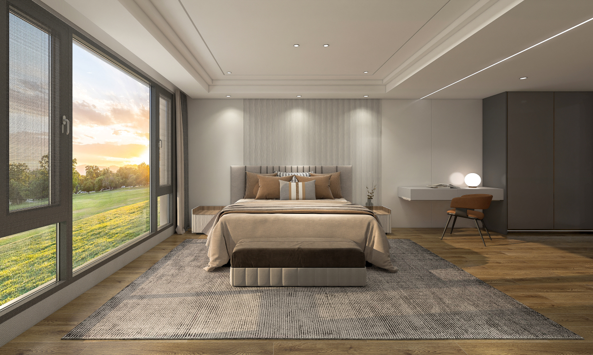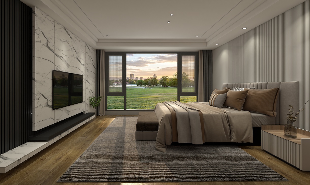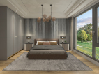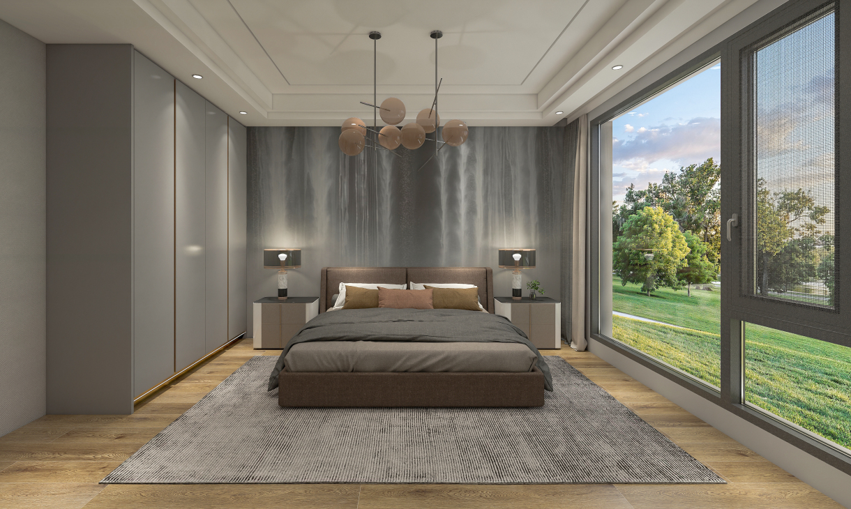 主臥內不同層次的灰調為空間帶來了松弛與靜謐,利落簡雅的設計語言將溫和的肌理、舒緩的氛圍描繪得淋漓盡致。安居其中,身體得以放松,心靈也獲慰藉。