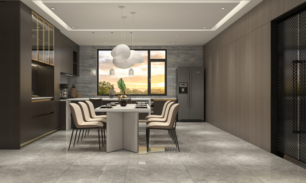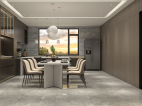 餐廳位于入門右側,延續著客廳柔和溫馨的格調,爵士白餐桌與米灰色餐椅搭配協調統一,呈現出視覺的輕盈感,讓餐廳空間通透流暢。餐廳吊燈正是圓形元素的延伸運用,強烈的造型感在空間內營造出了年輕化的時尚氛圍。
