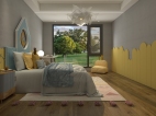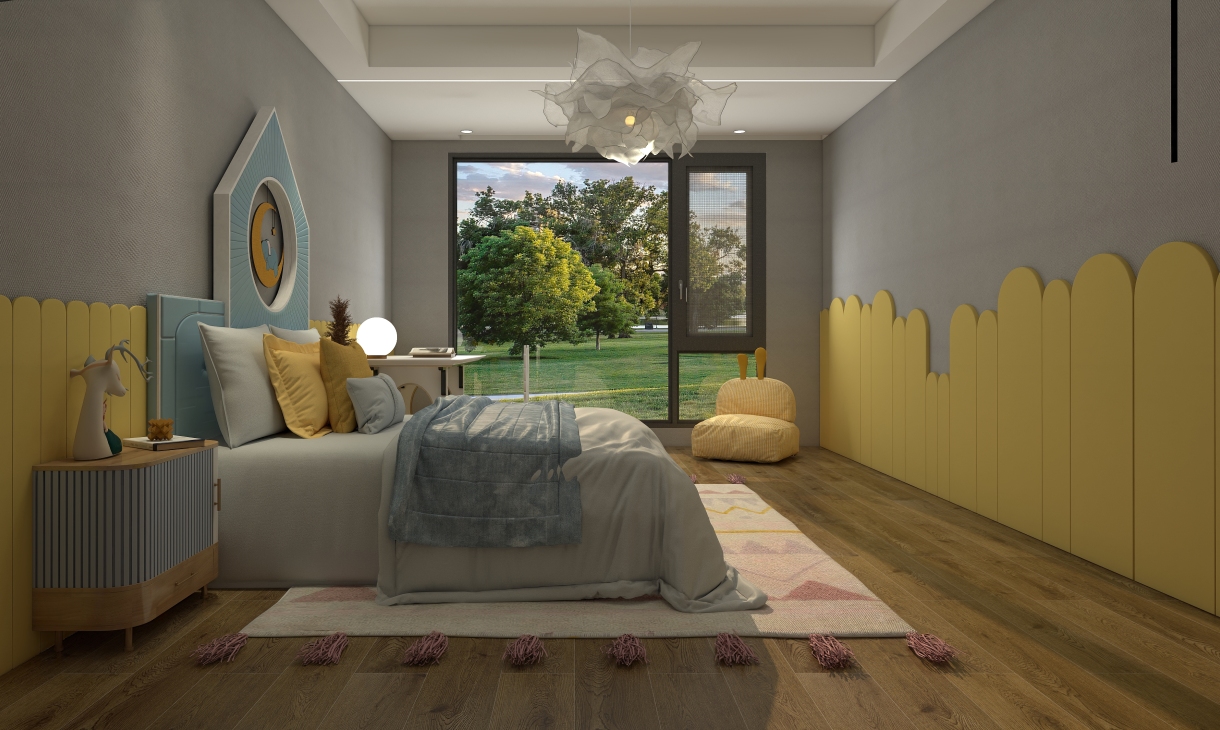 兒童房運用了明亮高級的黃色和灰色,醞釀出柔和活潑的空間意境,床品的彩色點綴更為空間添加了幾分明麗和活潑。