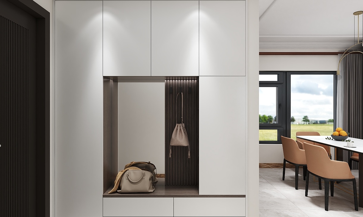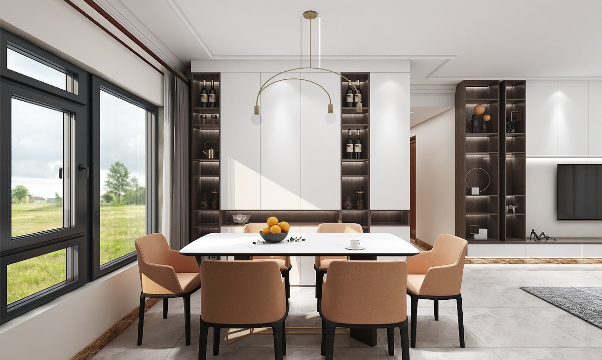 本案設計摒除過度裝飾,視覺中大面積的留白。客餐廳的良好采光,也讓屋主在這個空間里,具有更開闊的視野和更好的流通性,承重立柱以灰色鏡面圍覆,讓空間更加通透,同時形成的黑白灰顏色對比,使空間層次感更加豐富多變。