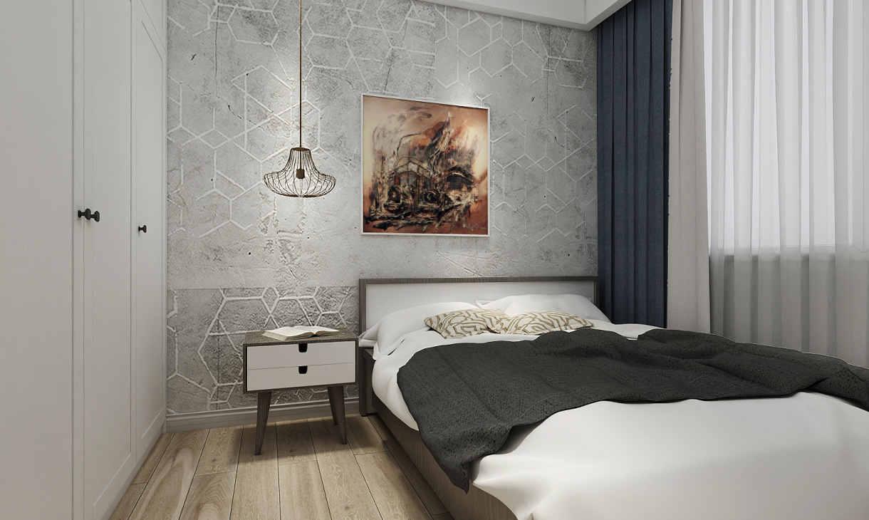 黑色床單化解了色調單一的尷尬。床頭運用吊燈,顯得氛圍頗好。