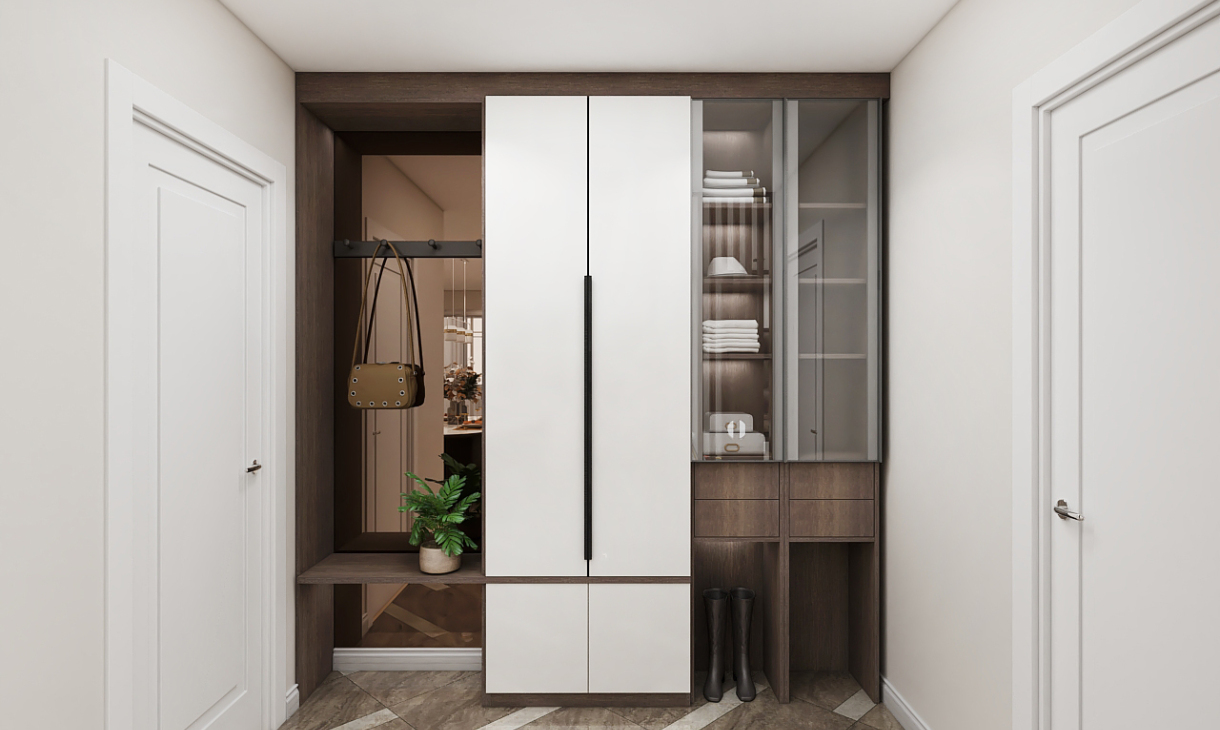 入戶柜功能齊全,有展示,掛衣,換鞋凳等區域。