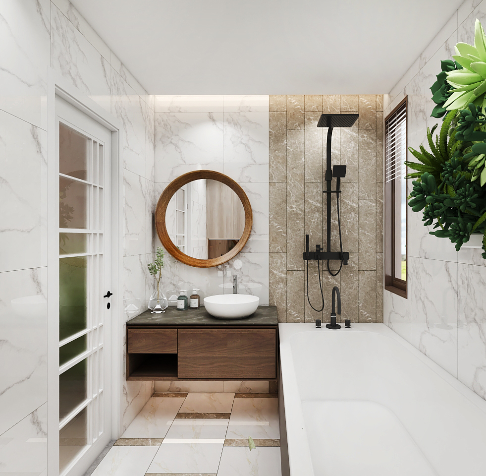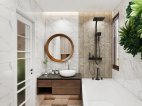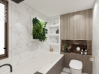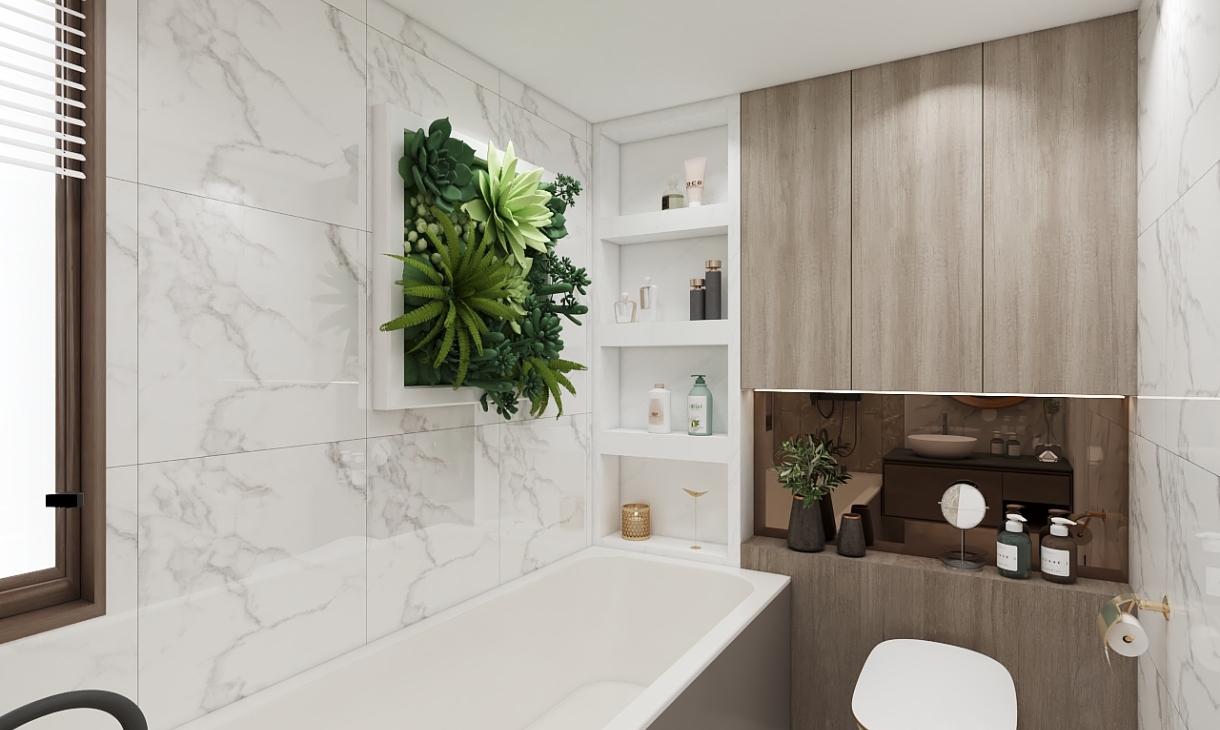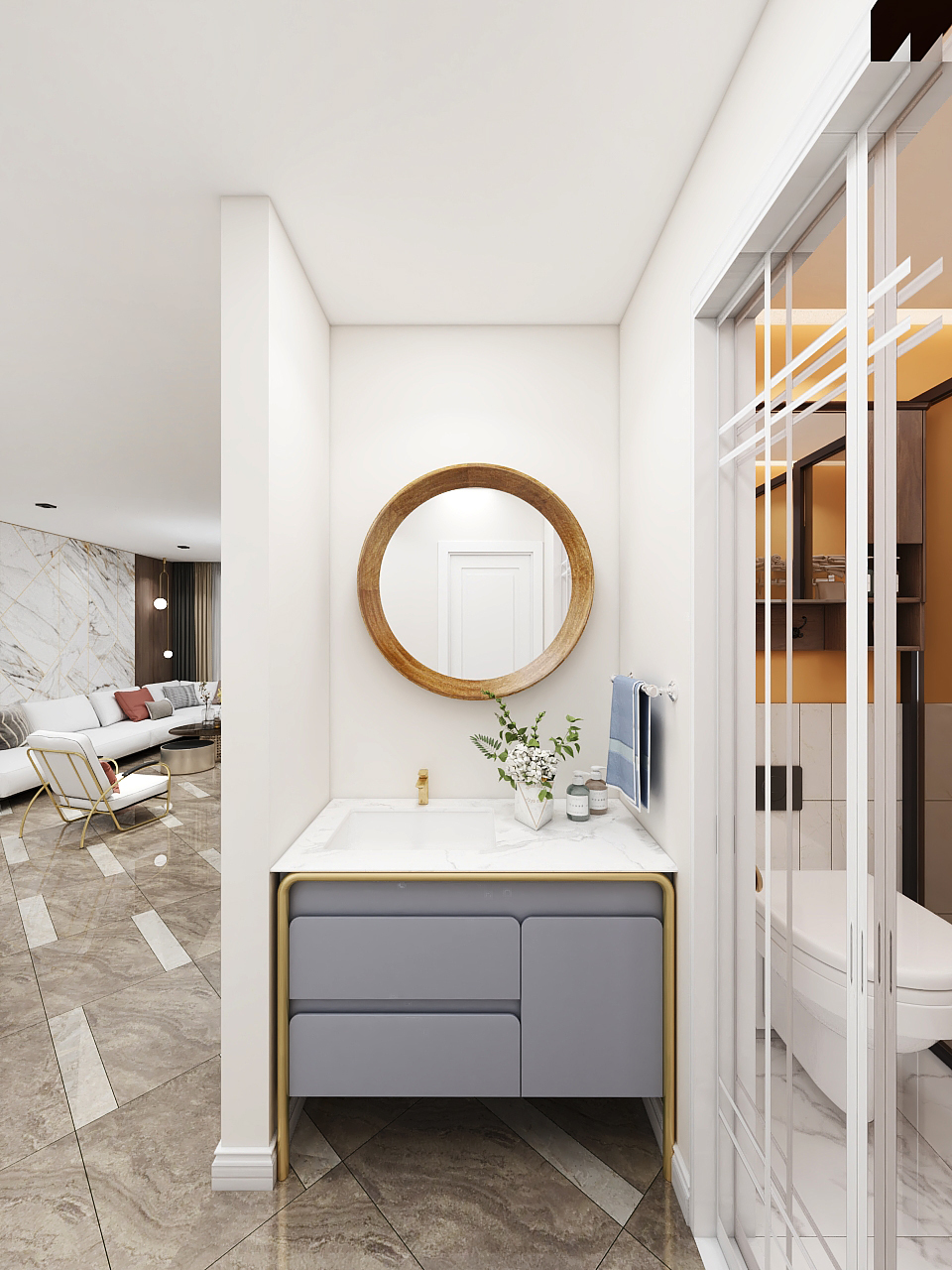 主衛功能齊全,色調與整體空間統一,木飾面搭配大理石,輕奢時尚。