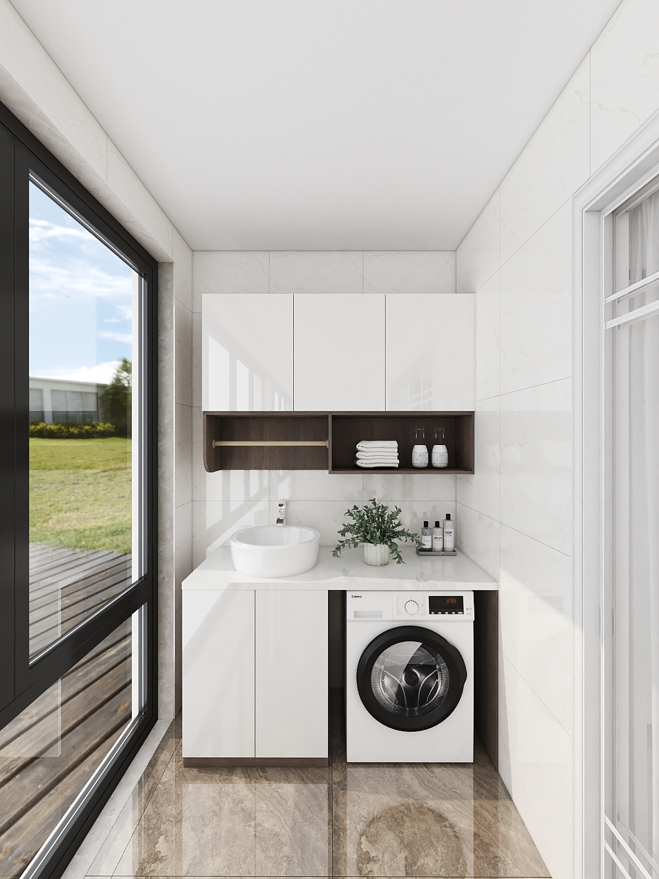 陽臺為生活陽臺可用洗衣機可手洗,收納柜可放置洗衣液等物品,方便實用。