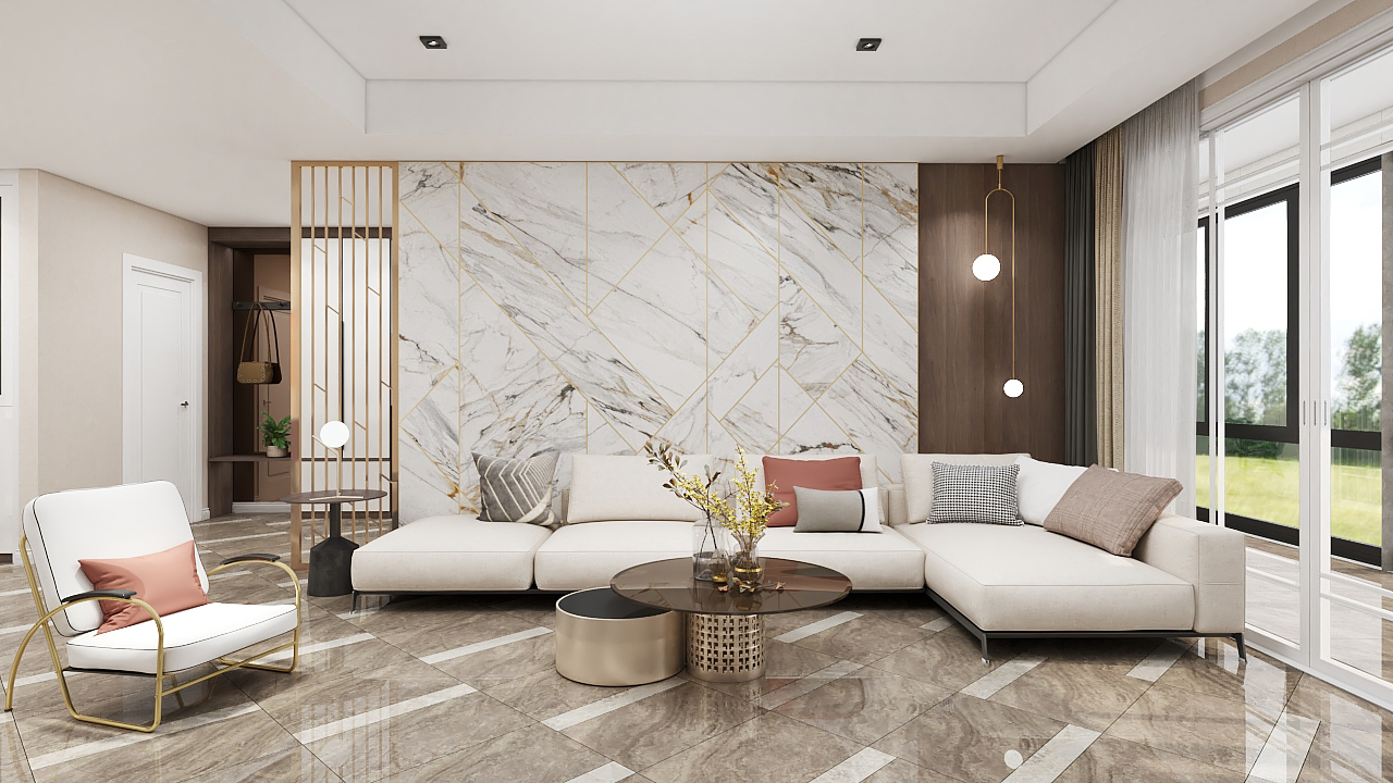 大理石地磚搭配木質織物,色調溫潤舒適。