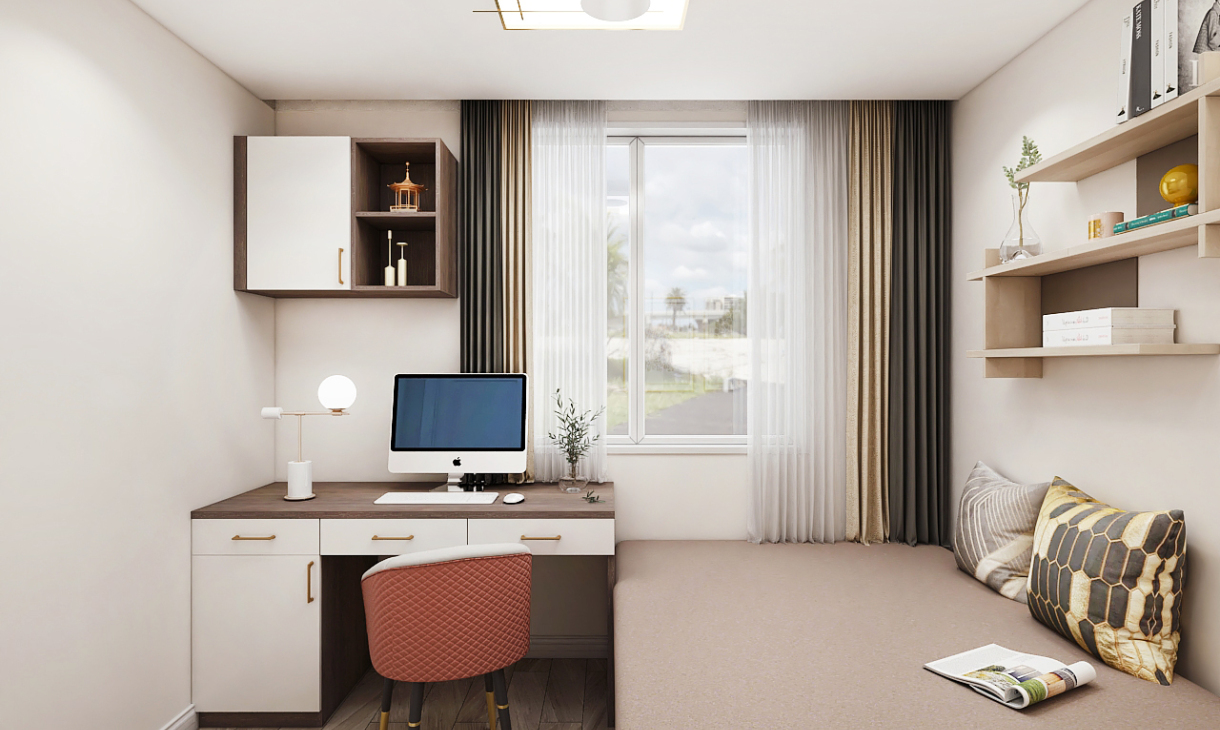 書房可做多功能房使用,榻榻米既可睡覺又可儲藏大量被褥物品等,書桌可供獨立辦公使用,溫馨而舒適,很好的利用空間利合理布局。