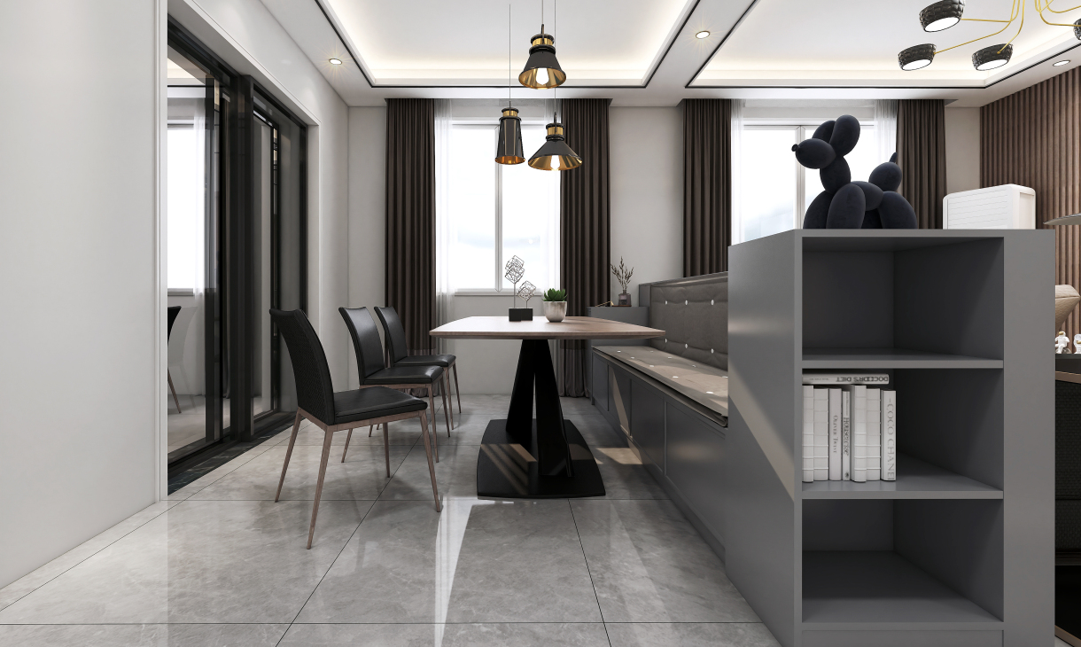 在餐廳設計上,因為是客廳餐廳一體,因此采用了卡座形式把兩個空間分割開來,形成相對獨立而又不失平衡的空間,加上獨特的魚線吊燈點綴,整個空間既溫馨又失高級感。