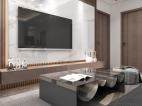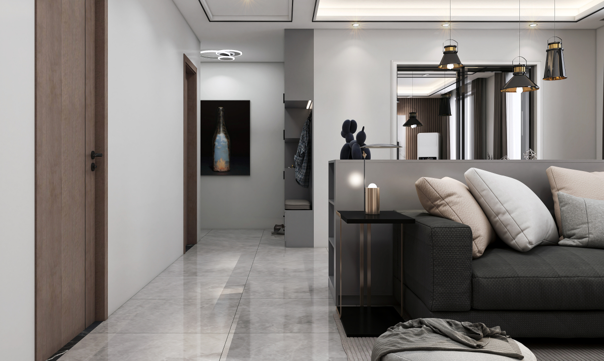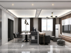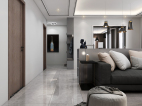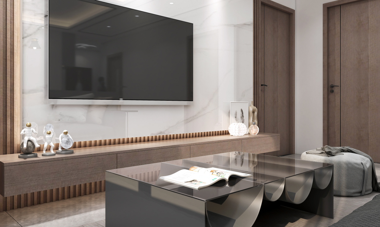 在客廳的設計上,利用了爵士白大理石做背景墻懸浮設置,暗藏燈帶,而懸掛電視柜與格柵造型背景融為一體,整體搭配起來十分上檔次。