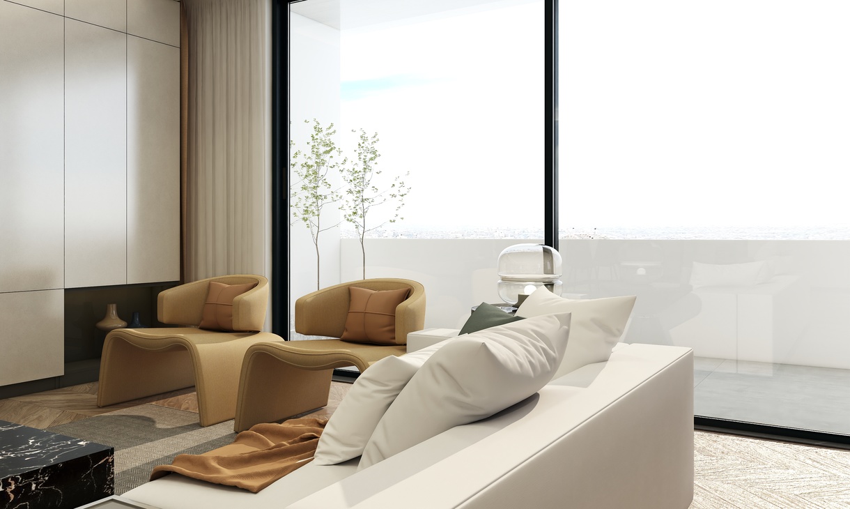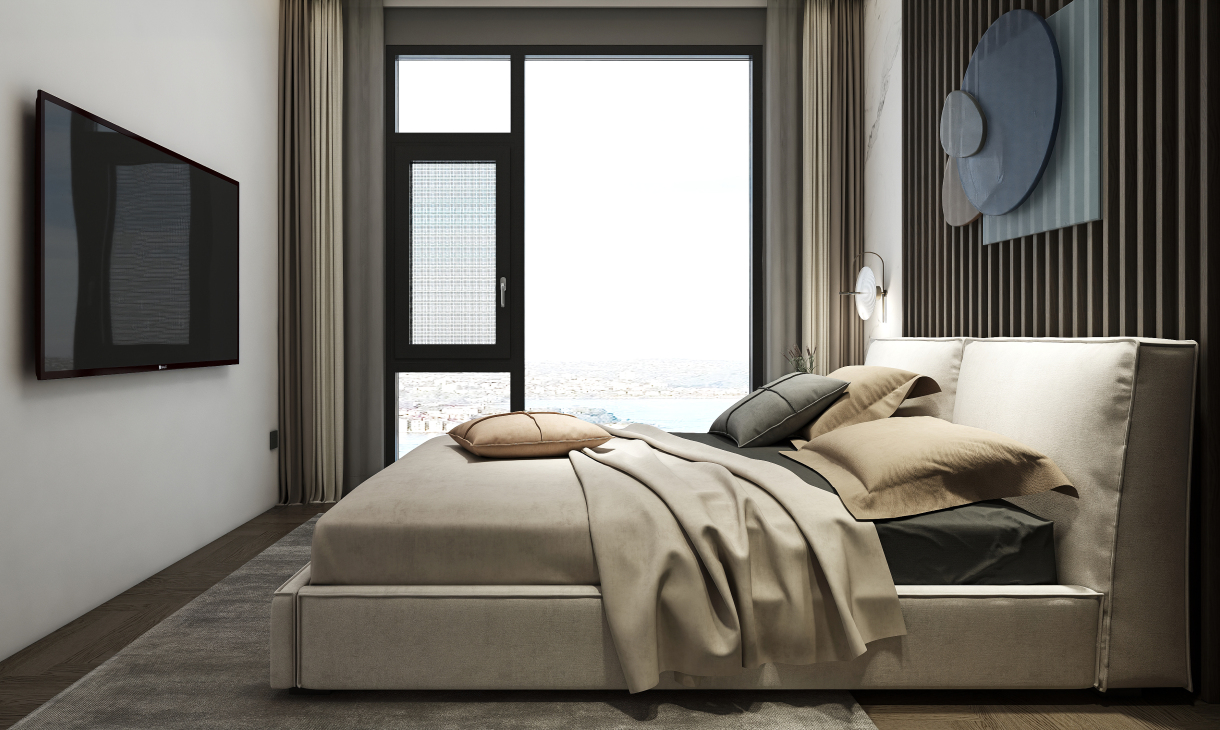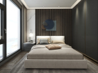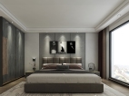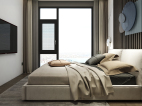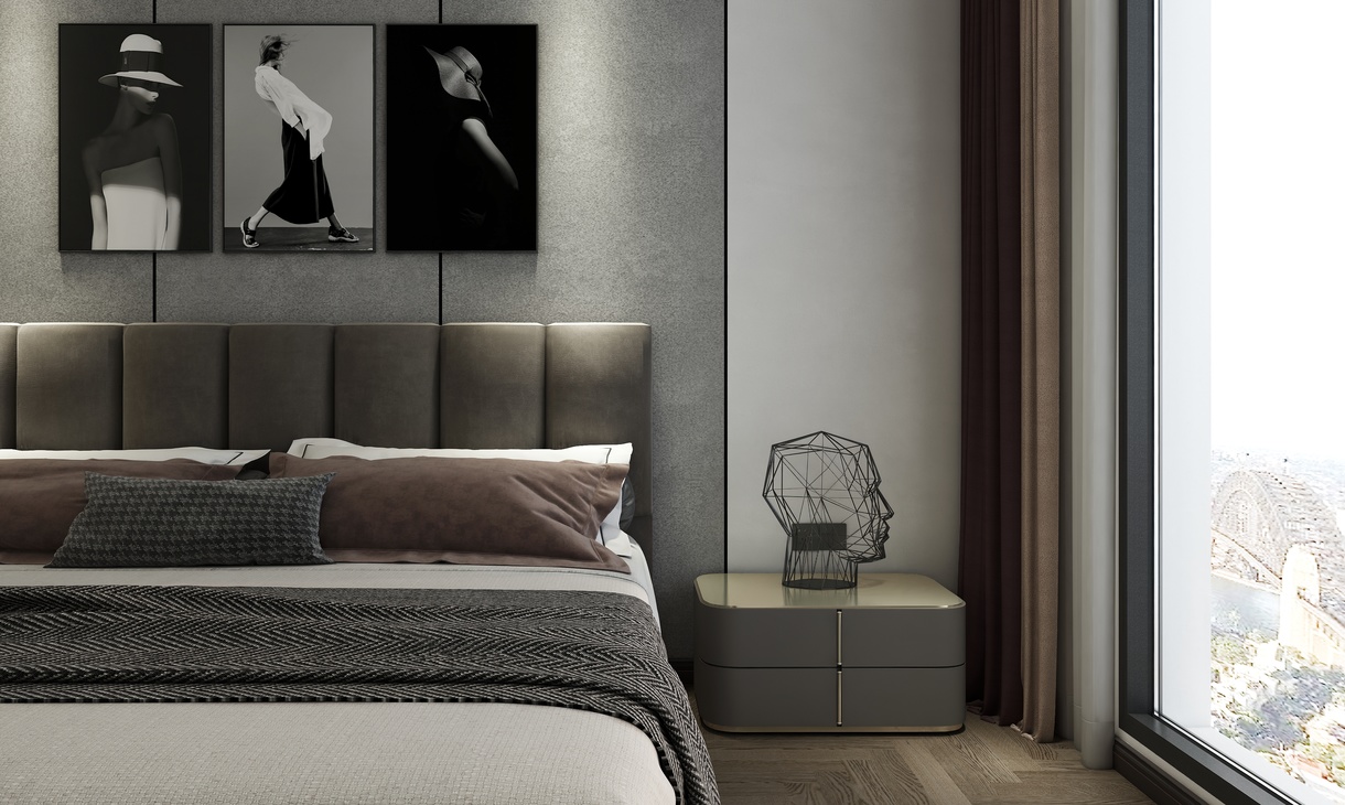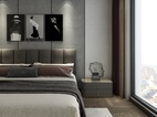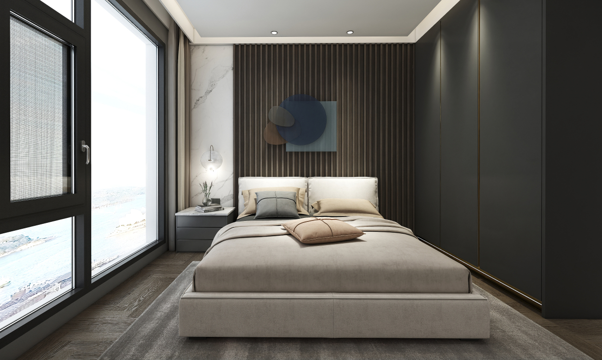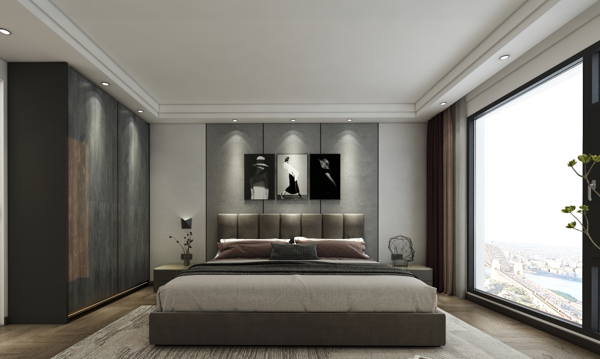 主臥設置180°落地窗,對外可瞰城市江景之繁華,對內可享私人空間之靜謐。夜幕降臨,人間失明,光化作柳葉刀,刺破黑夜的軀體,以落地窗為載體,為主人上映斑斕耀眼的城市夜景