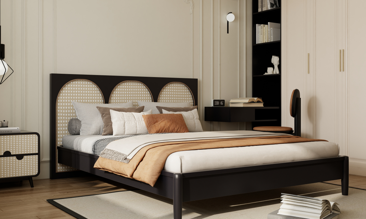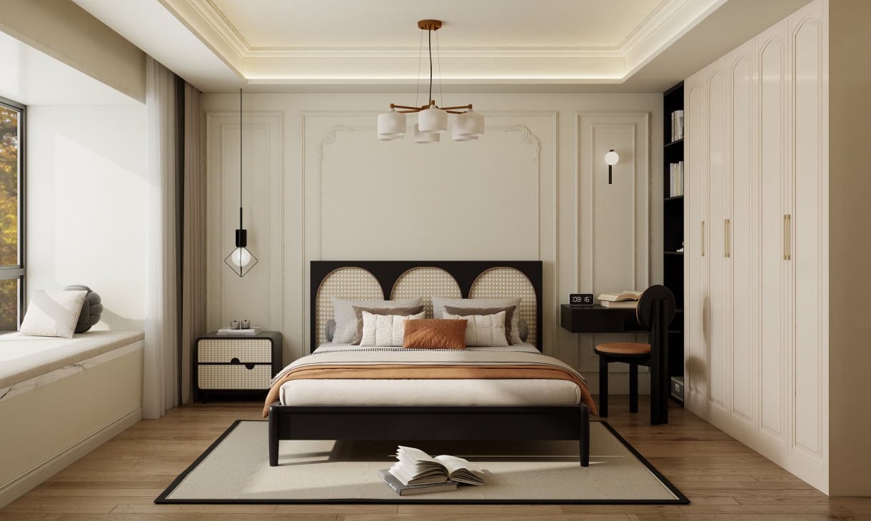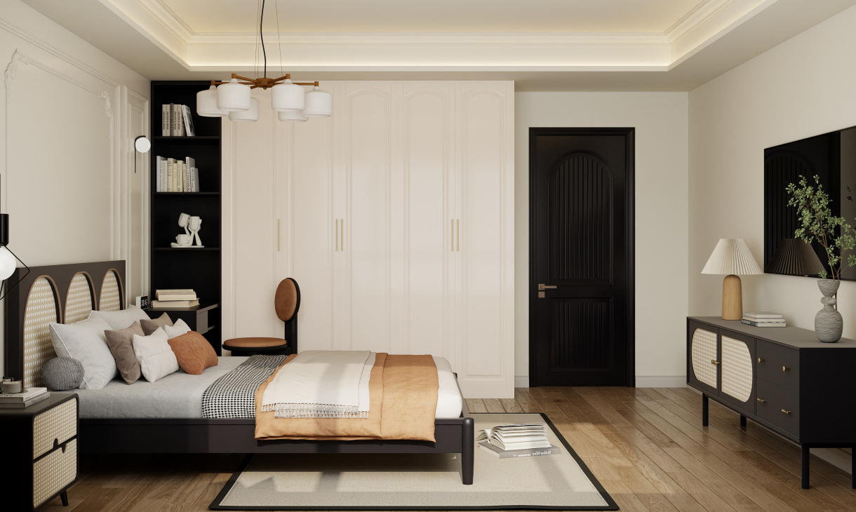 該臥室設(shè)計(jì)采用了輕法式,以奶油白為主色調(diào),搭配上黑色和淺藤編的家具,營造出法式復(fù)古的沉穩(wěn)與高雅。橙色點(diǎn)綴不僅打破黑白的單調(diào),同時為臥室注入了活力與溫暖,讓空間更有層次。