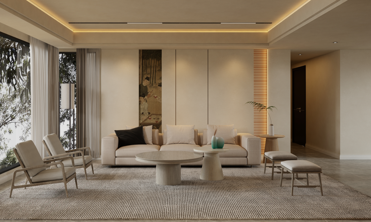 本方案基于新中式的設(shè)計的風(fēng)格基調(diào),將設(shè)計元素進(jìn)一步提煉簡化,同時大量融入暖色的燈光設(shè)計,讓新中式的設(shè)計風(fēng)格中帶入了更多的溫馨氛圍和簡約的感受。
