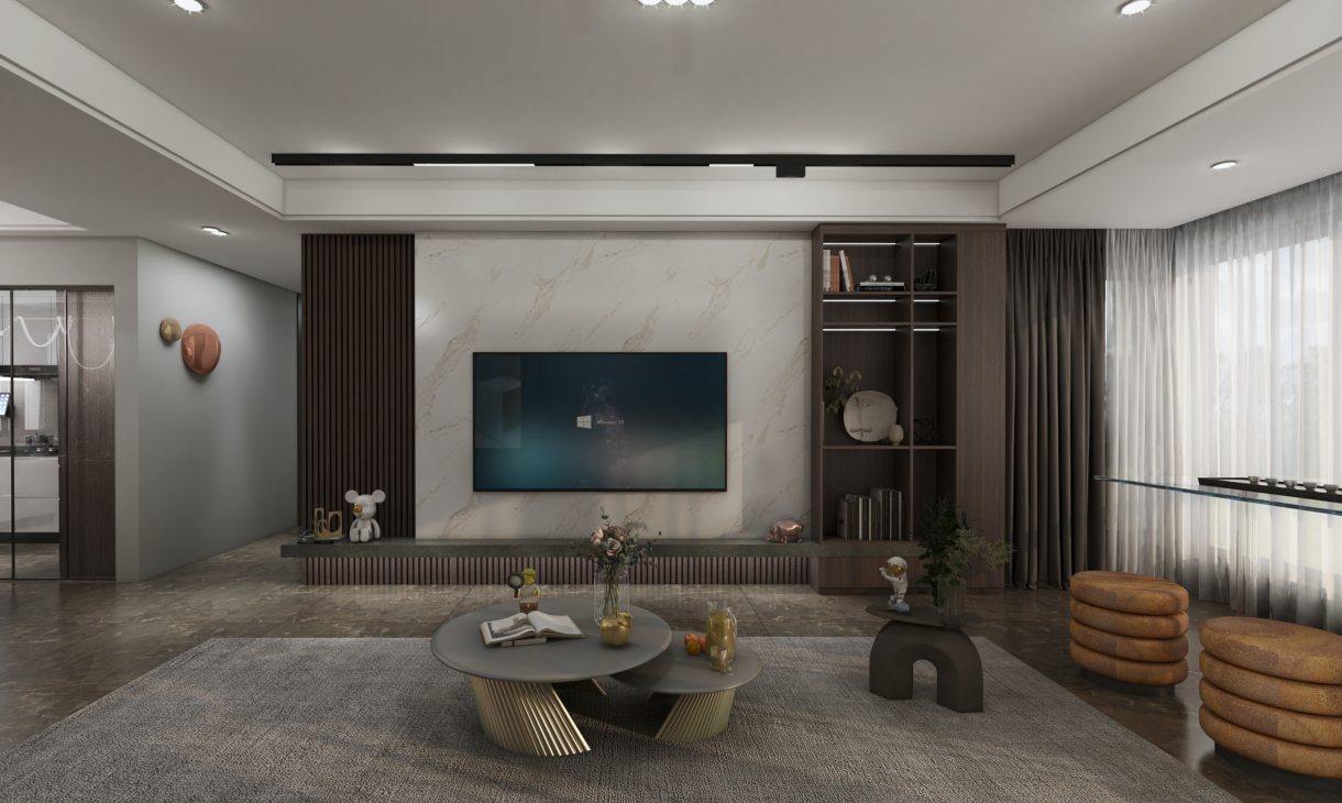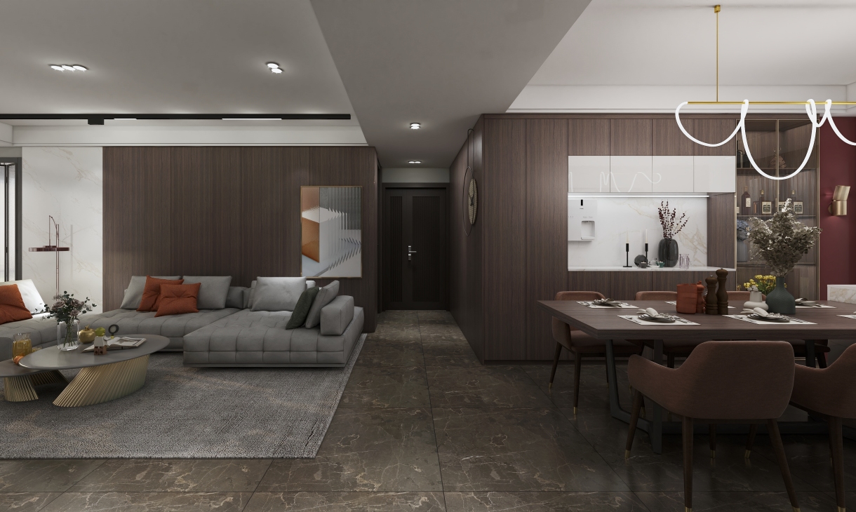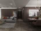 業主是南通本地的90后年輕夫妻,對于現代的設計手法十分喜愛,對于她的新家希望好好地營造一番,業主特地委托我們給她設計,經過多次的溝通和交流,明確了她們家的設計需求:客廳以木飾面石材為主要材料,帶島臺的餐桌設計,突出現代的調性。圍繞著業主明確的設計要求,材質上我們采用了深色的瓷磚.淺色的石材搭配深色的木飾面,綜合運用,整體精致且高級,色調上我們放棄太過純艷的色調,以暖灰色為整體,同時以暗紅色為點綴,在客廳上利用淺色的大理石和柵格結合做出懸空的電視背景墻,純粹簡介,整體大氣美觀。