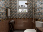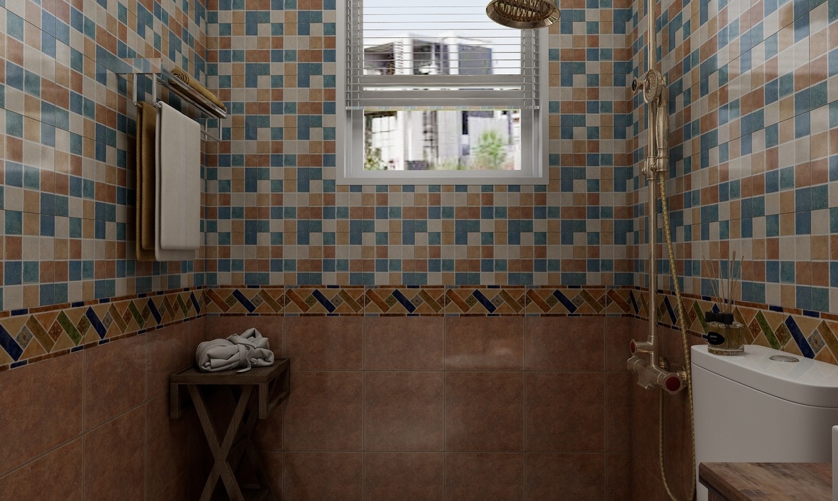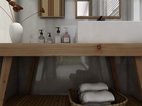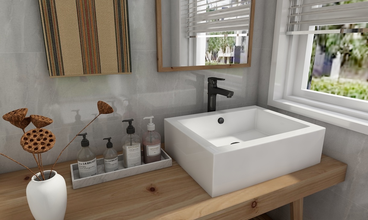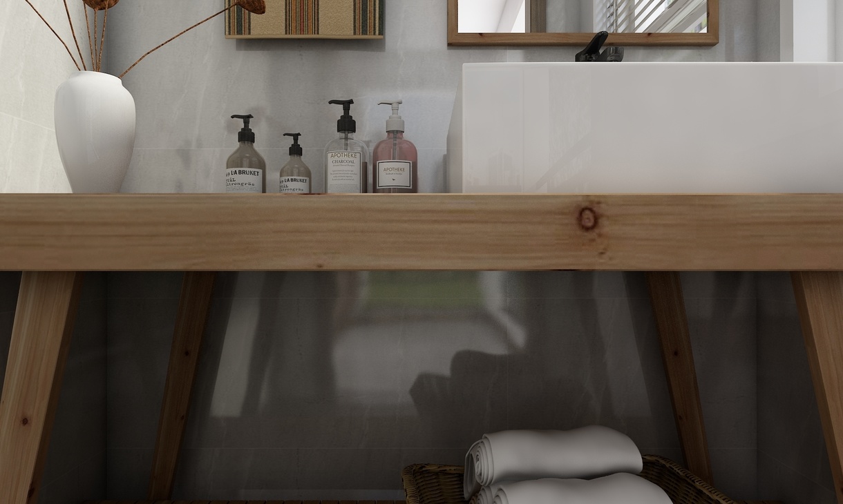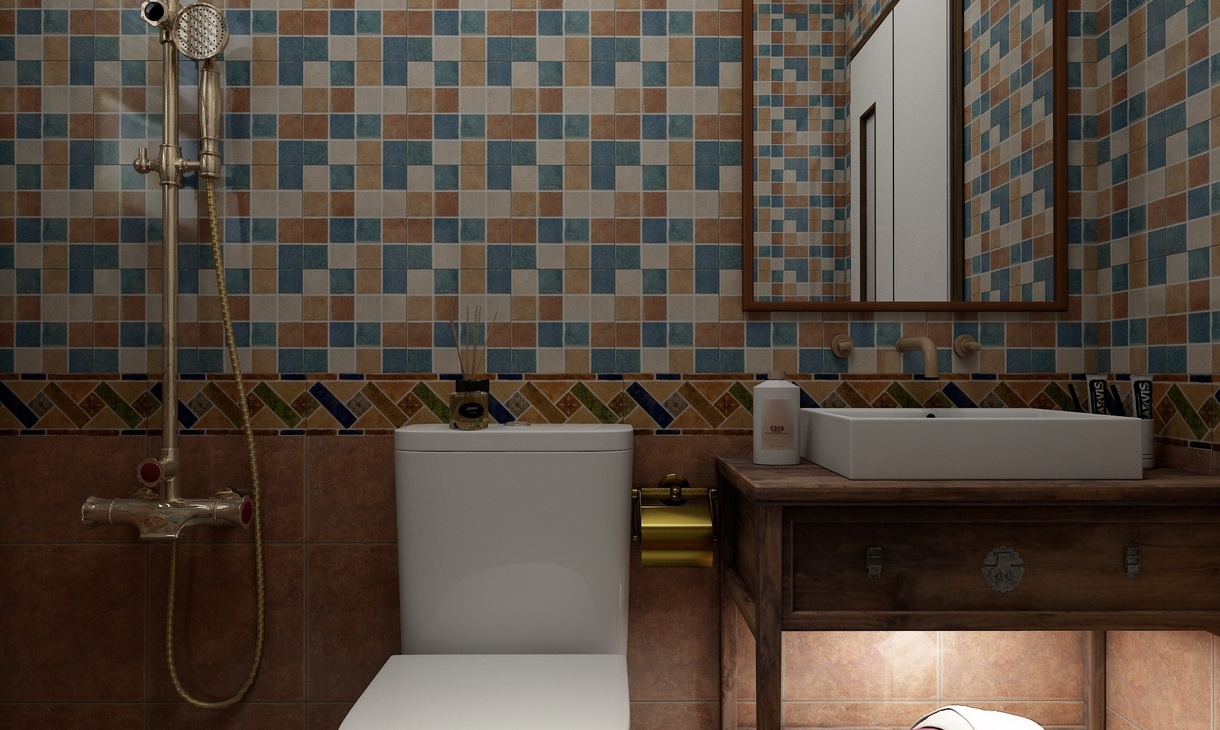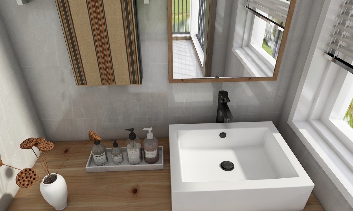 受空間限制,衛生間滿足日常需求即可。金色花灑與原木色洗漱臺搭配靈活,沉穩而不深沉